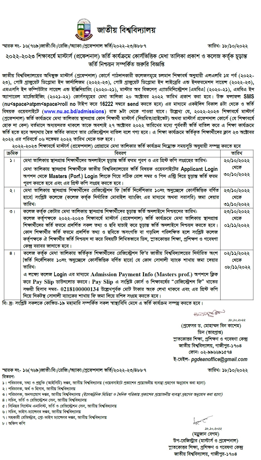 - সংশ্লিষ্ট কলেজ কর্তৃক মেধা তালিকায় স্থানপ্রাপ্ত শিক্ষার্থীদের চূড়ান্ত ভর্তি নিশ্চয়নের সময়সীমাঃ ২৩/১০/২০২২ তারিখ থেকে ০১/১১/২০২২ তারিখ।