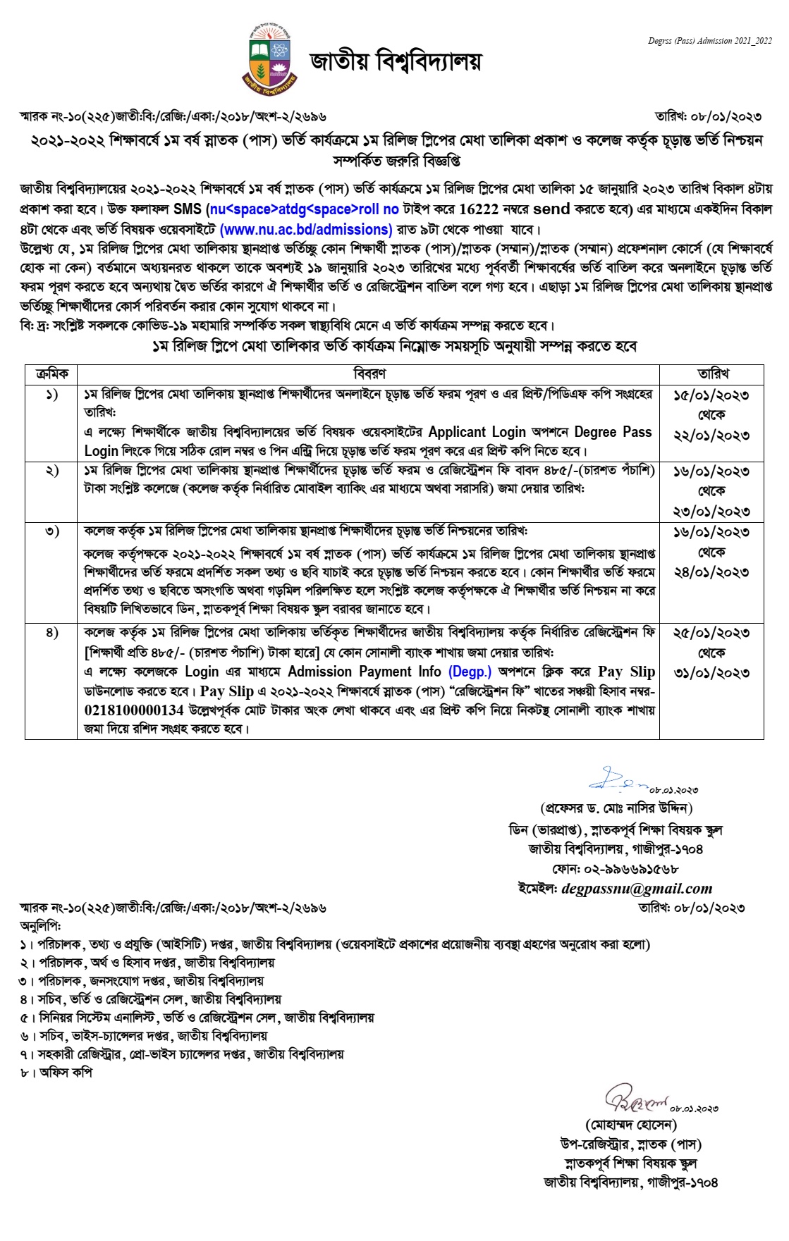 জাতীয় বিশ্ববিদ্যালয়ে ডিগ্রি ১ম রিলিজ স্লিপে ভর্তির সময়সীমা