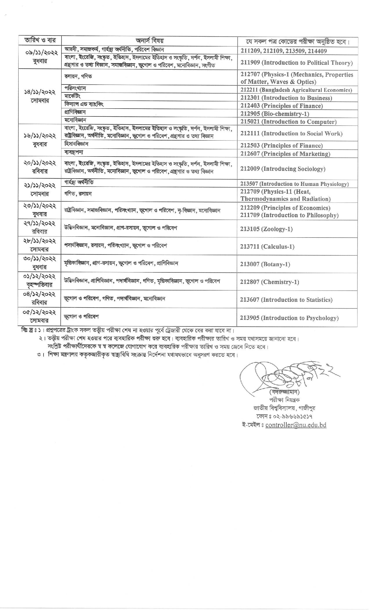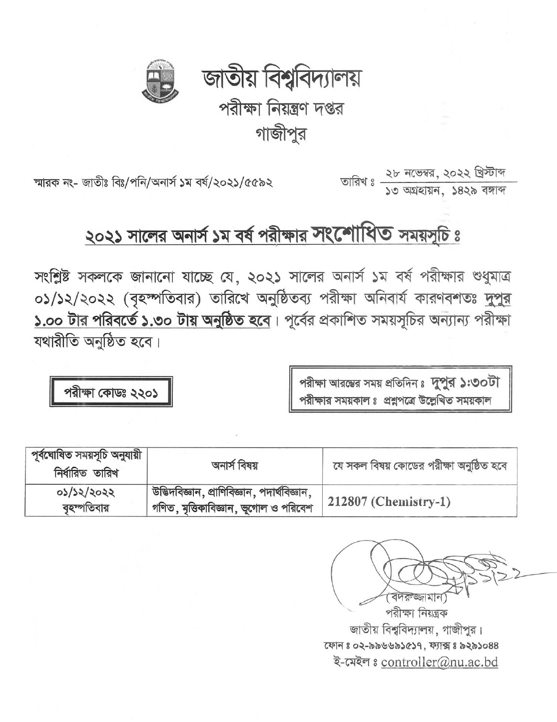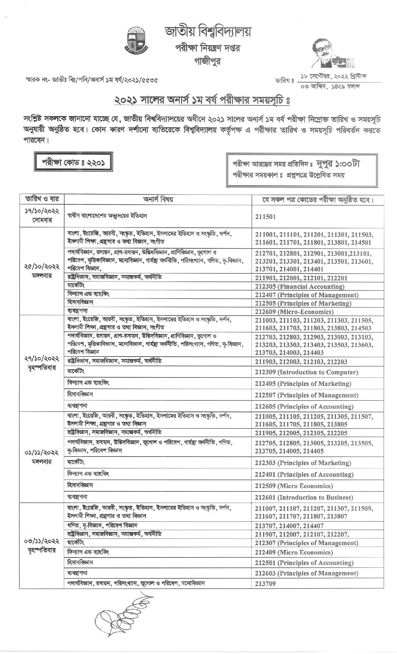 জাতীয় বিশ্ববিদ্যালয়ের অনার্স ১ম বর্ষের পরীক্ষার রুটিন ২০২২