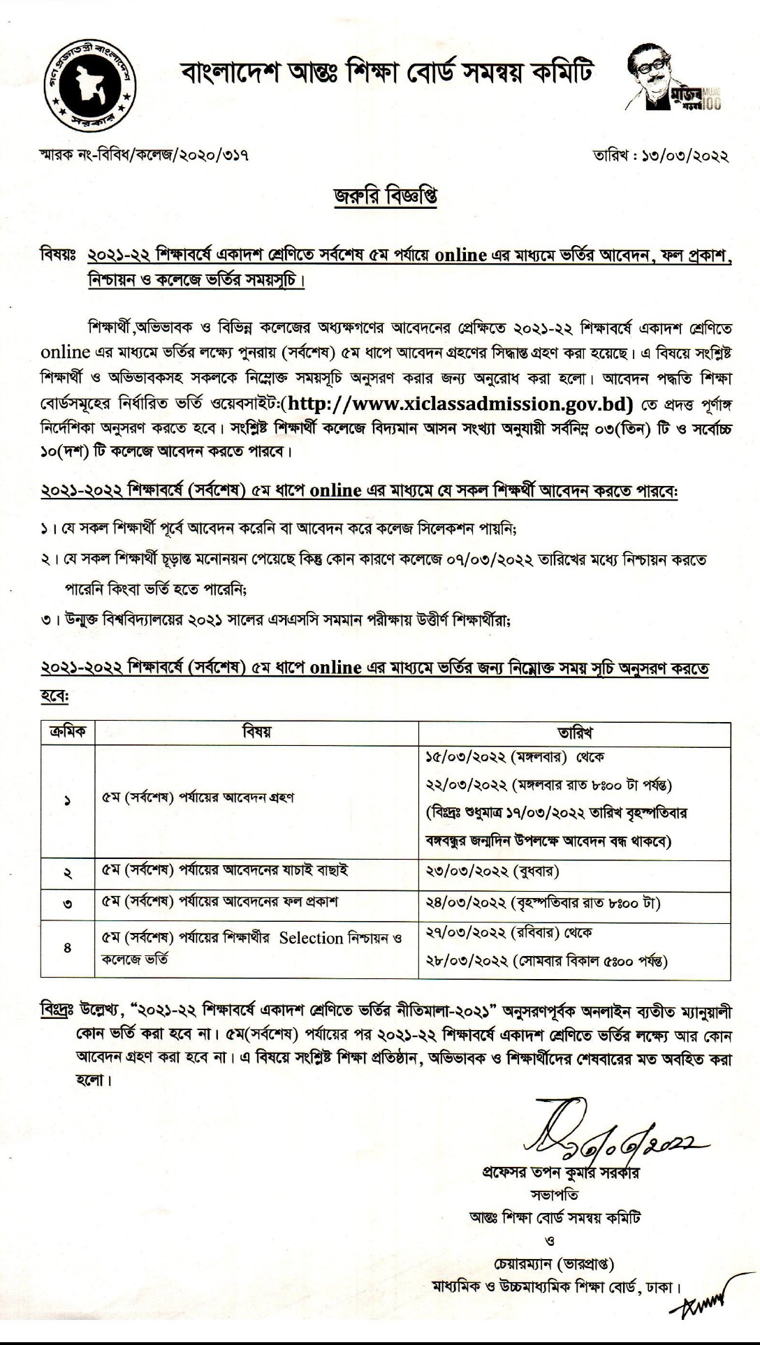একাদশ শ্রেণিতে সর্বশেষ ৫ম পর্যায়ে অনলাইনে ভর্তি বিজ্ঞপ্তি ২০২১-২০২২ দেখুন এখানে