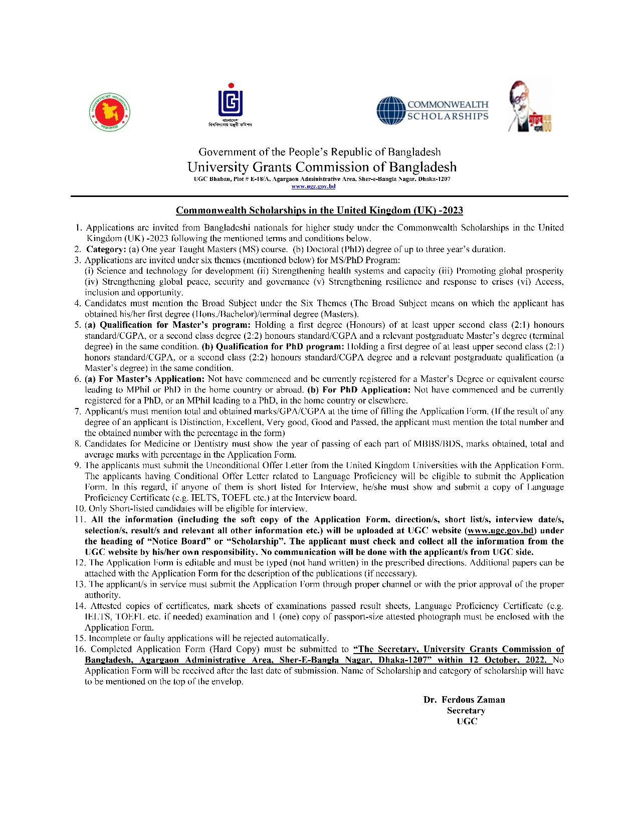 কমনওয়েলথ স্কলারশিপ ২০২৩ বিজ্ঞপ্তি প্রকাশিত হয়েছে। যুক্তরাজ্যে স্কলারশিপ নিয়ে স্নাতককোত্তর এবং পিএইচডি করতে ইচ্ছুক বাংলাদেশী শিক্ষার্থীরা কমনওয়েলথ বৃত্তি ২০২২ এর জন্য আবেদন করতে পারবেন। কমনওয়েলথ স্কলারশিপস ইন দ্যা ইউনাইটেড কিংডম ২০২৩ এর জন্য দরখাস্তের আহ্বান করেছেন বাংলাদেশ বিশ্ববিদ্যালয়ে মঞ্জুরী কমিশন (ইউজিসি)। আবেদন করা যাবে আগামী ১২ অক্টোবর ২০২২ পর্যন্ত।