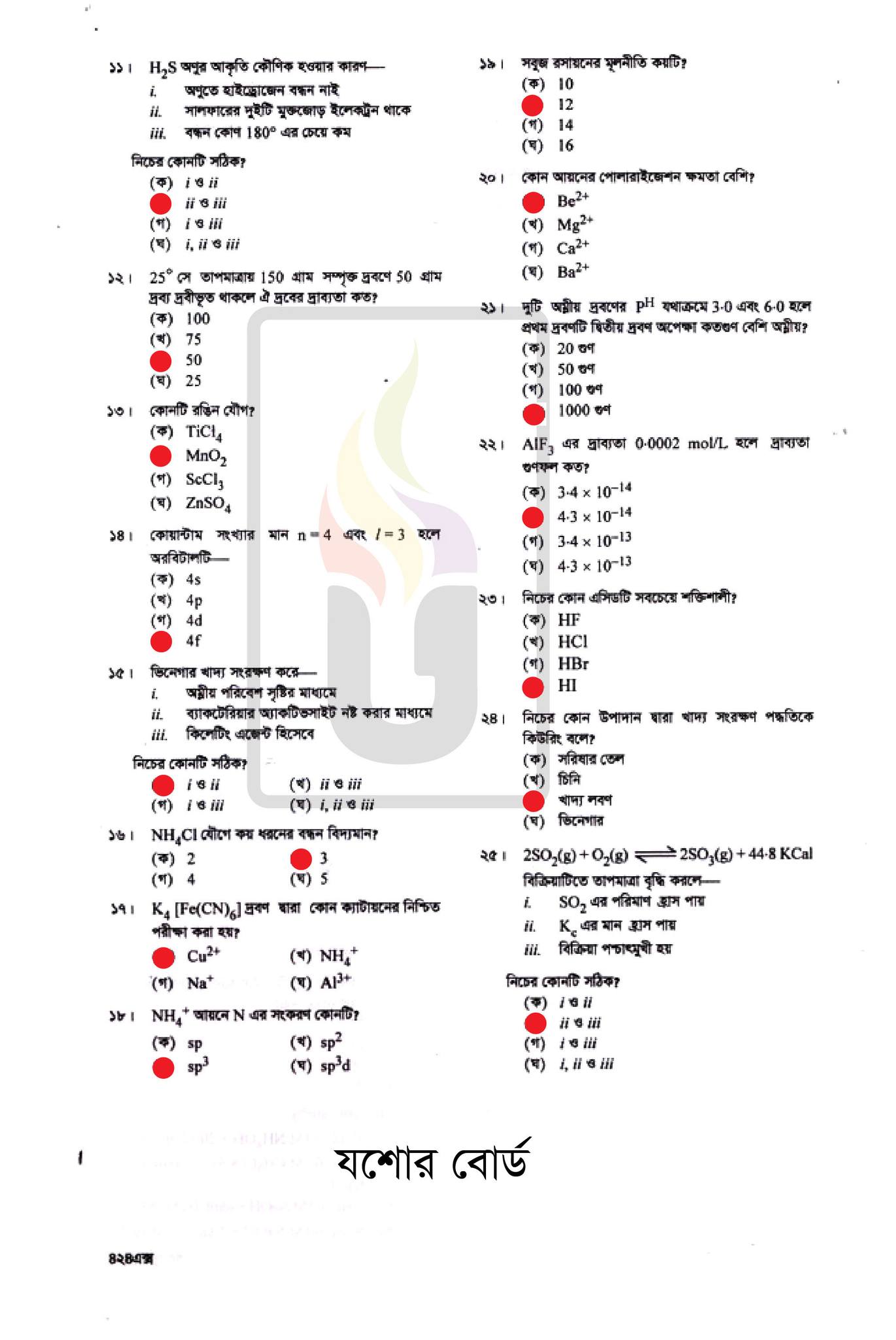 যশোর বোর্ড এইচএসসি রসায়ন ১ম পত্র প্রশ্ন সমাধান ২০২২