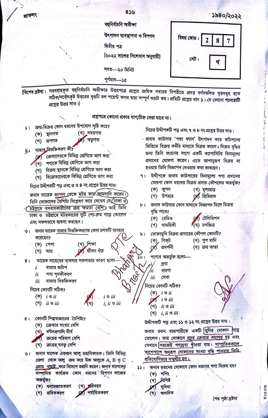 এইচএসসি উৎপাদন ব্যবস্থাপনা ও বিপণন ২য় পত্র MCQ প্রশ্ন সমাধান ২০২২