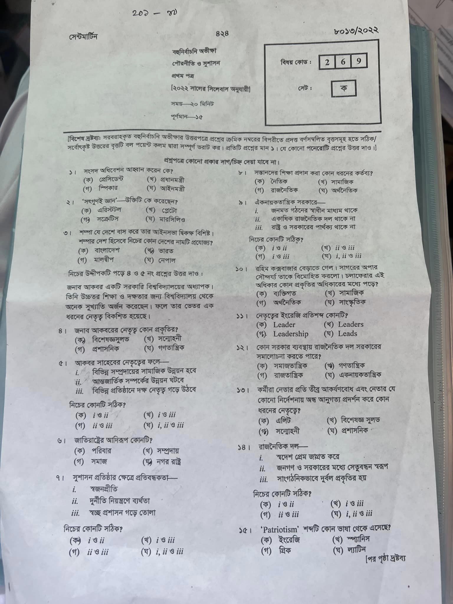HSC প্রশ্ন সমাধান 2022: পৌরনীতি ও সুশাসন ১ম পত্র