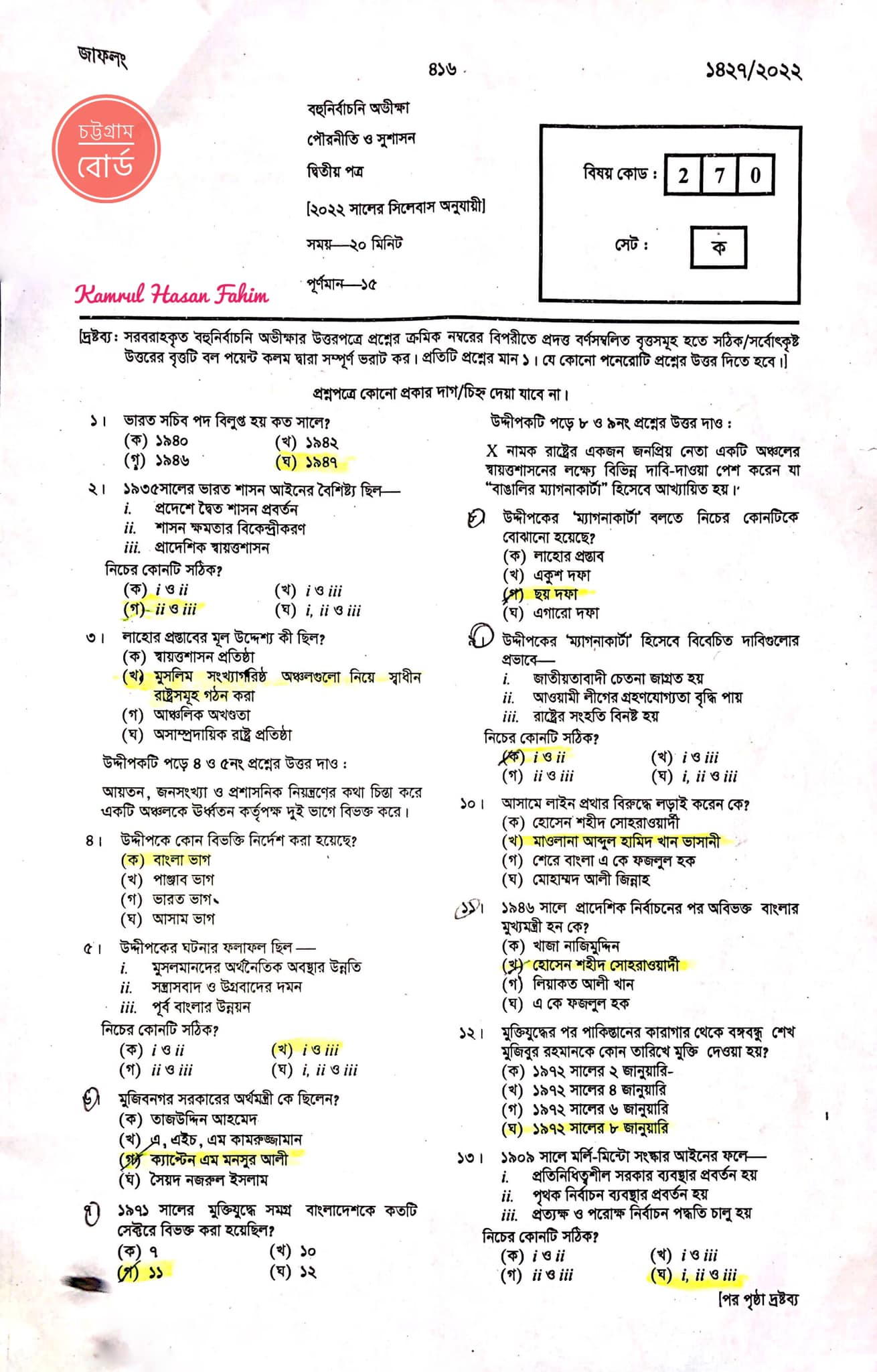 চট্টগ্রাম বোর্ড এইচএসসি পৌরনীতি ও সুশাসন ২য় পত্র প্রশ্ন সমাধান ২০২২