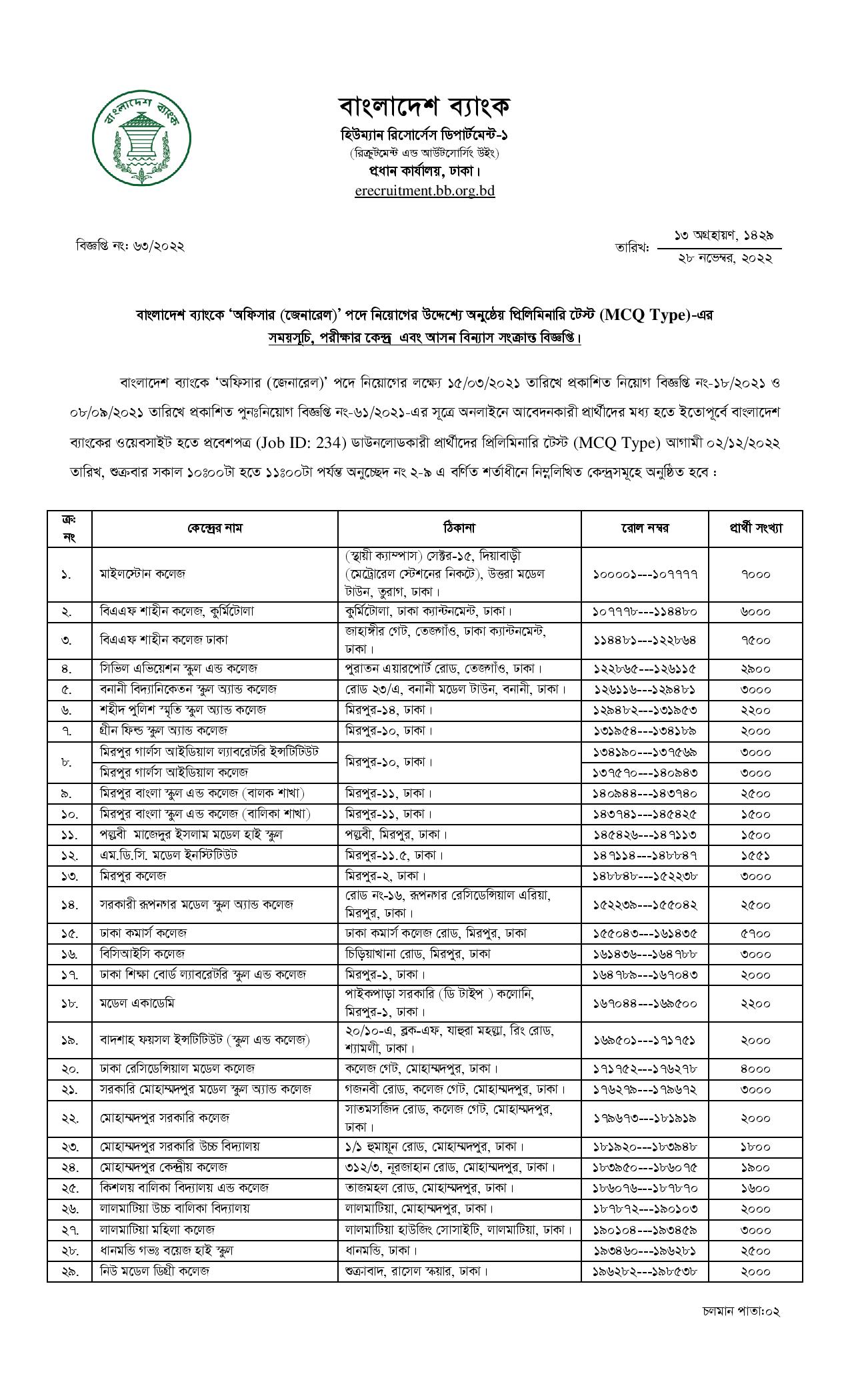 You can download Bangladesh Bank General Officer Exam Schedule and Seat Plan pdf file from here. Bangladesh Bank Officer General Recruitment Exam will be held on 02 December 2022. This examination will be held in 74 educational institutions of the capital Dhaka. Bank Officer General Seat Plan:
