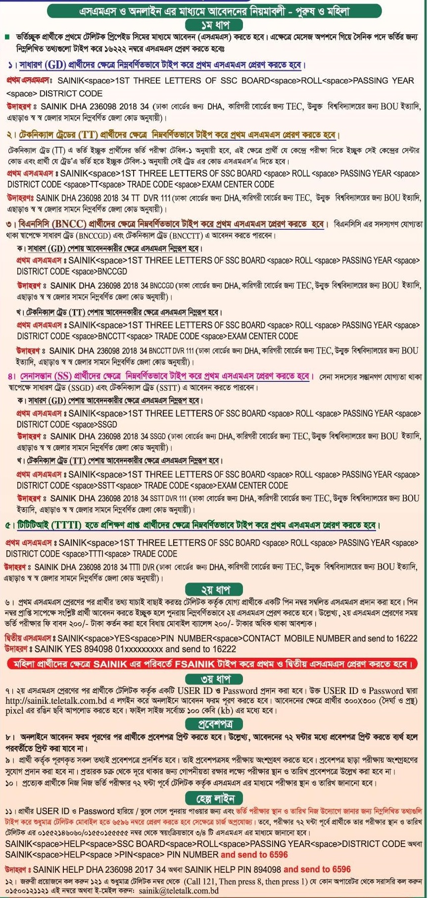 বিশেষ দ্রষ্টব্য: মহিলা প্রার্থীদের ক্ষেত্রে SAINIK এর পরিবর্তে FSAINIK টাইপ করে ১ম ও ২য় এসএমএস করতে হবে।