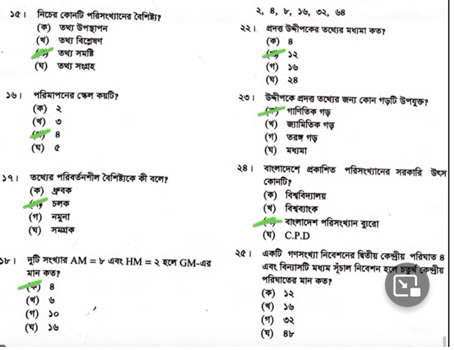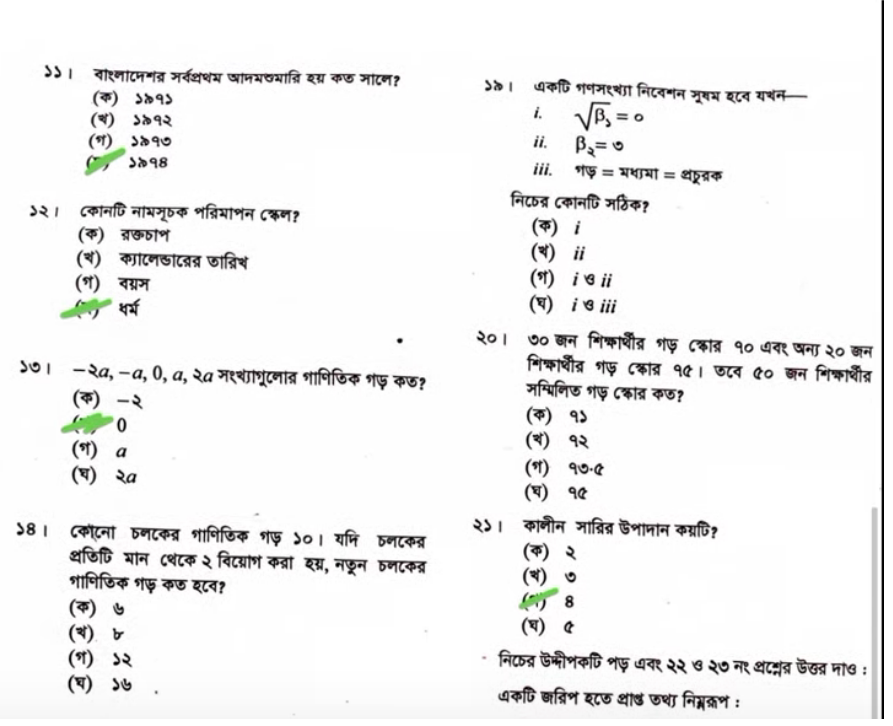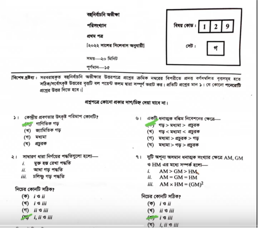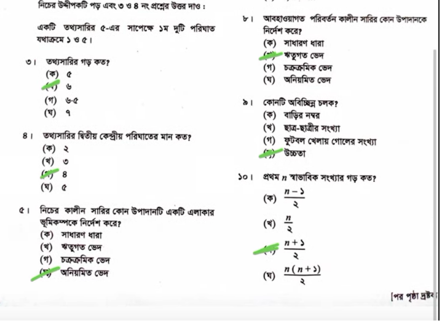 সংশোধনঃ ১৪. খ, ১৯. ঘ, ২০. খ, ২৩. (খ) জ্যামিতিক গড়, ২৫. ঘ