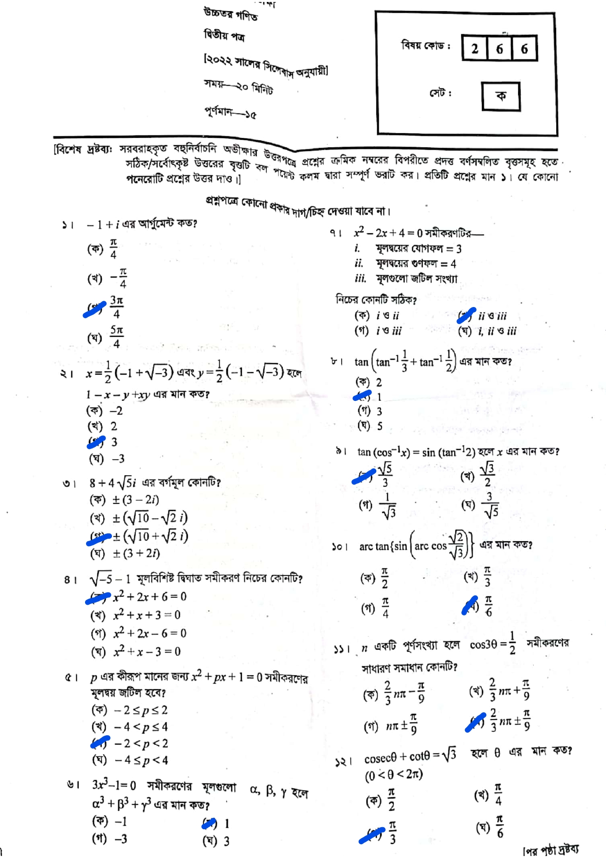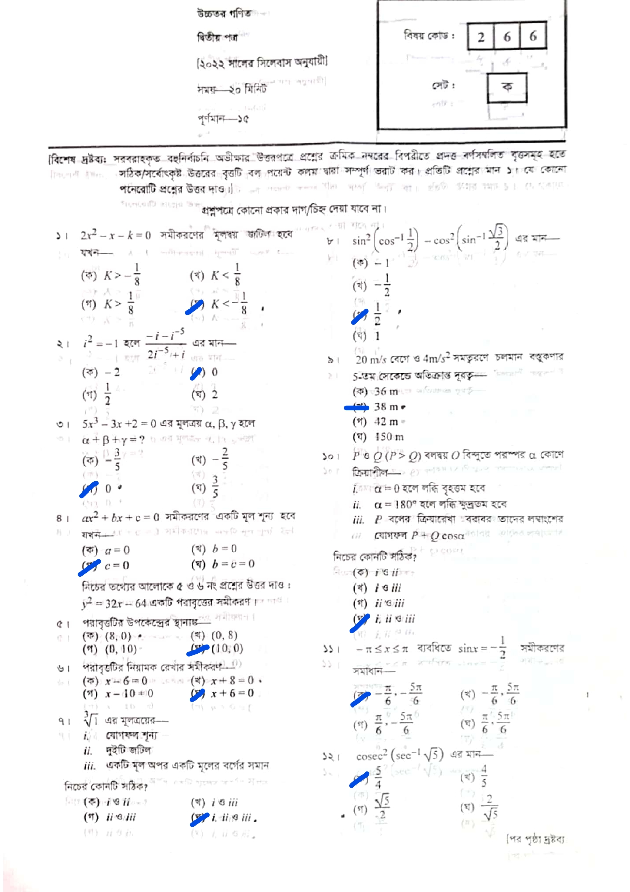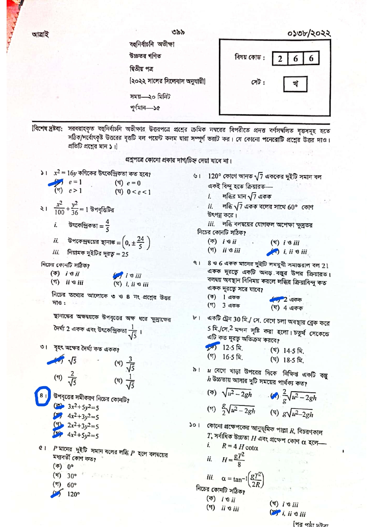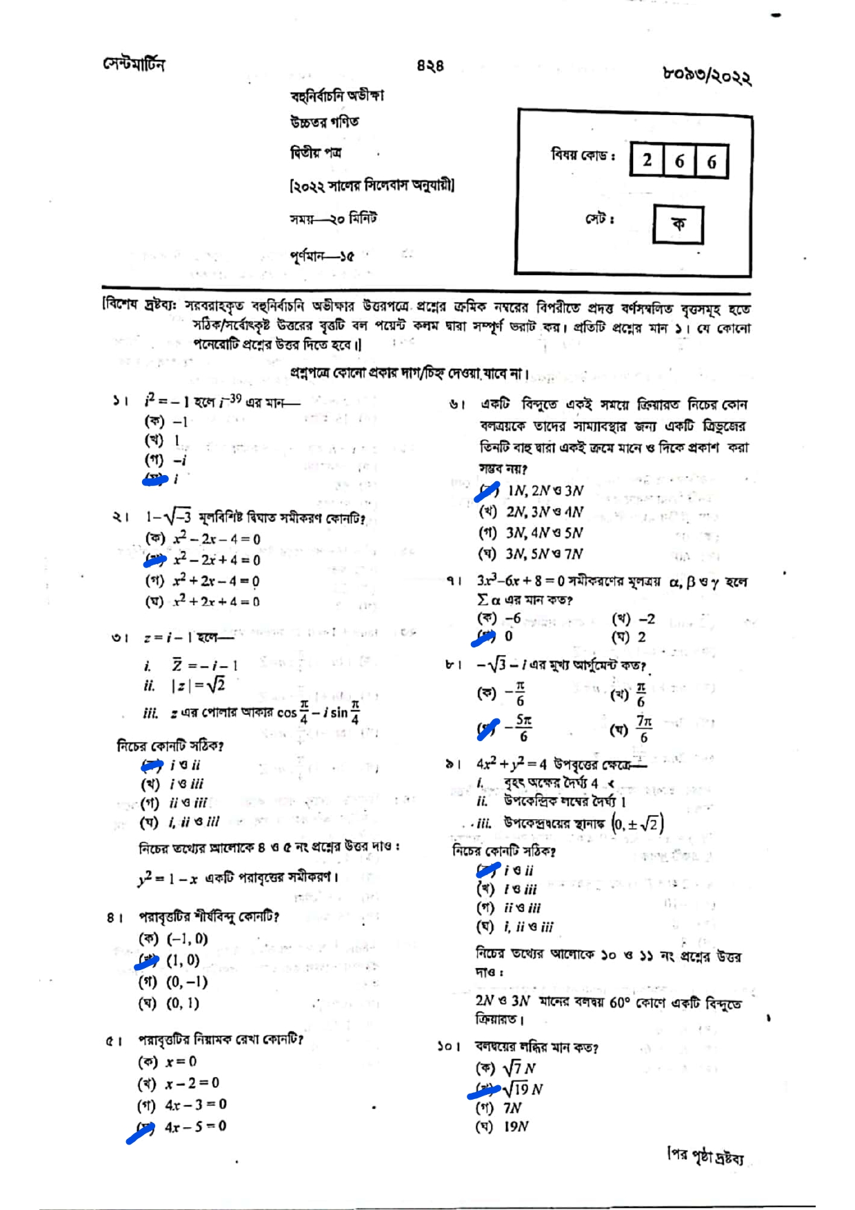 এইচএসসি উচ্চতর গণিত ২য় পত্র পত্র প্রশ্ন সমাধান ২০২২ এমসিকিউ অংশ