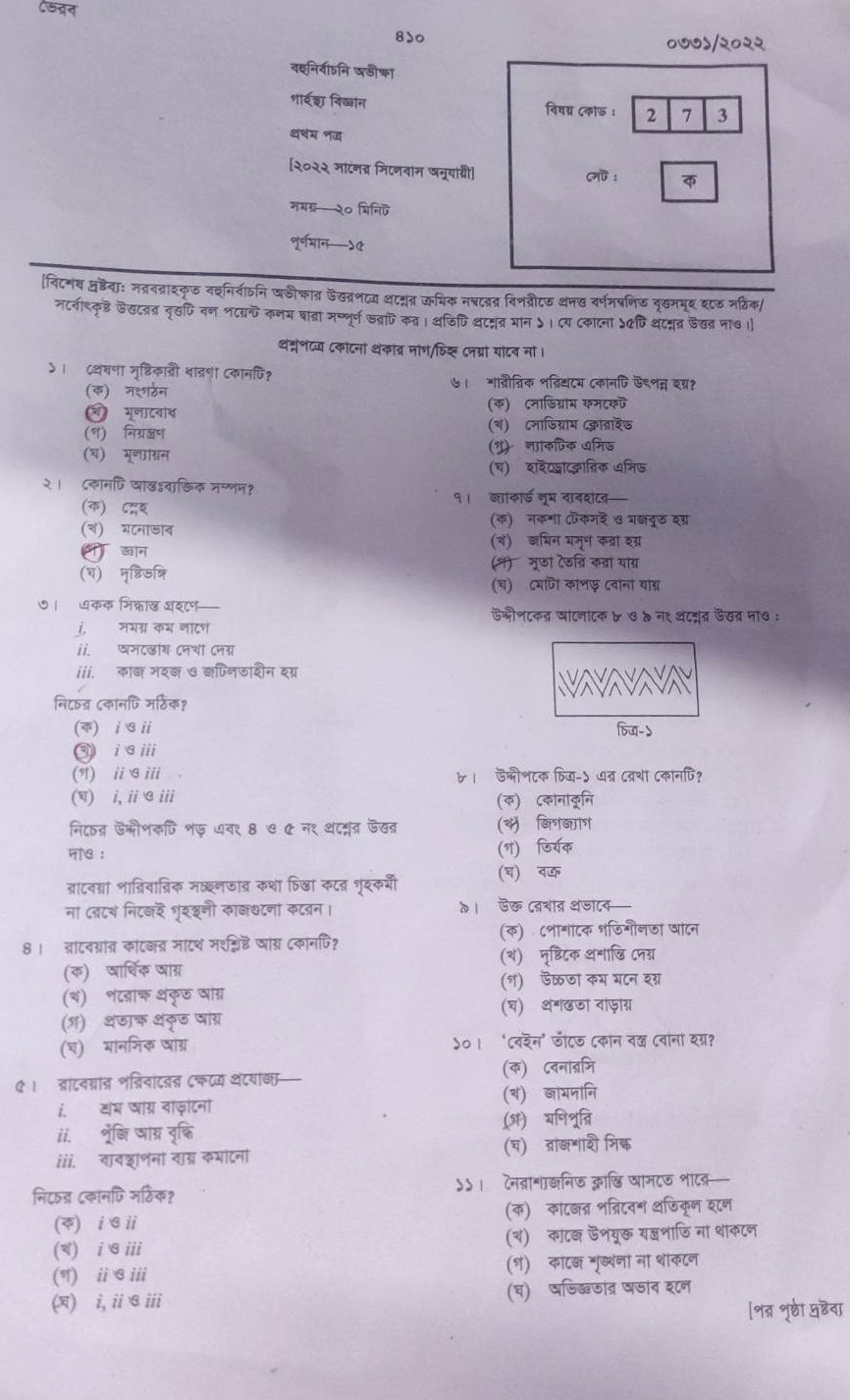 এইচএসসি গার্হস্থ্য বিজ্ঞান ১ম পত্র MCQ প্রশ্ন সমাধান ২০২২