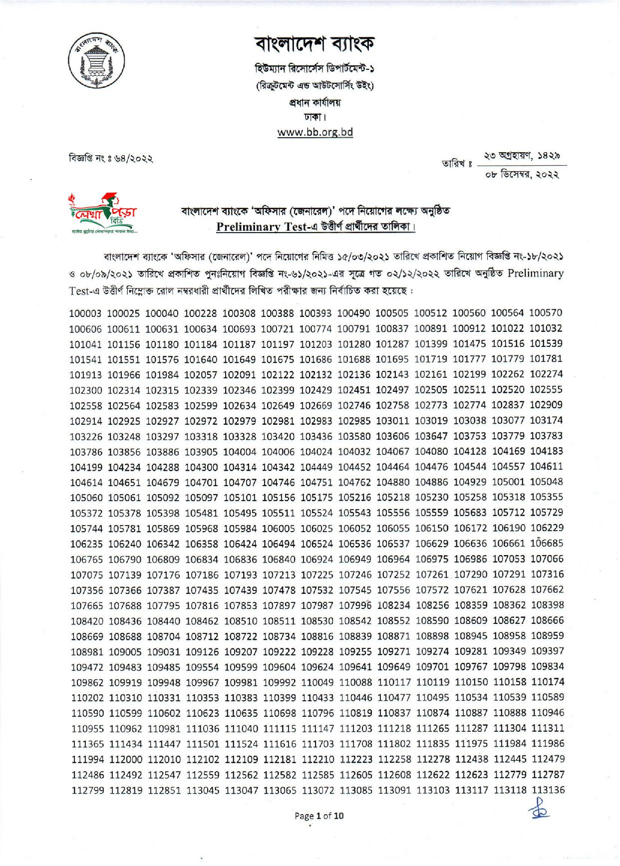 ব্যাংক অফিসার জেনারেল নিয়োগ ফলাফল ২০২২ pdf পেজ ১০