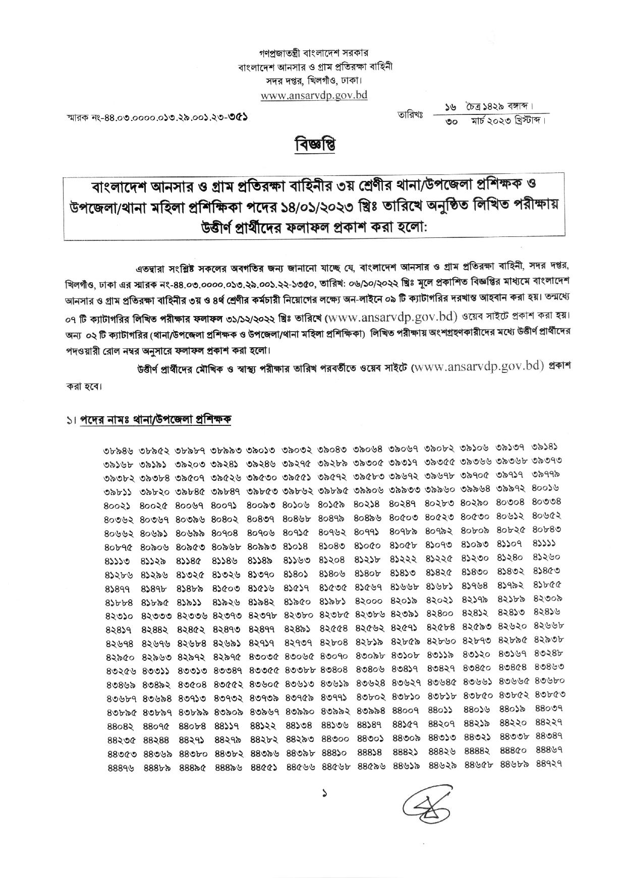 আনসার নিয়োগ পরীক্ষার রেজাল্ট pdf ডাউনলোড