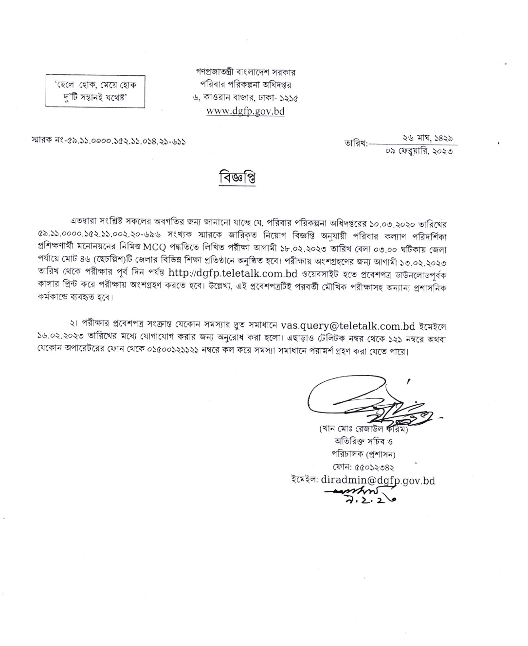 পরিবার পরিকল্পনা নিয়োগ পরীক্ষার তারিখ