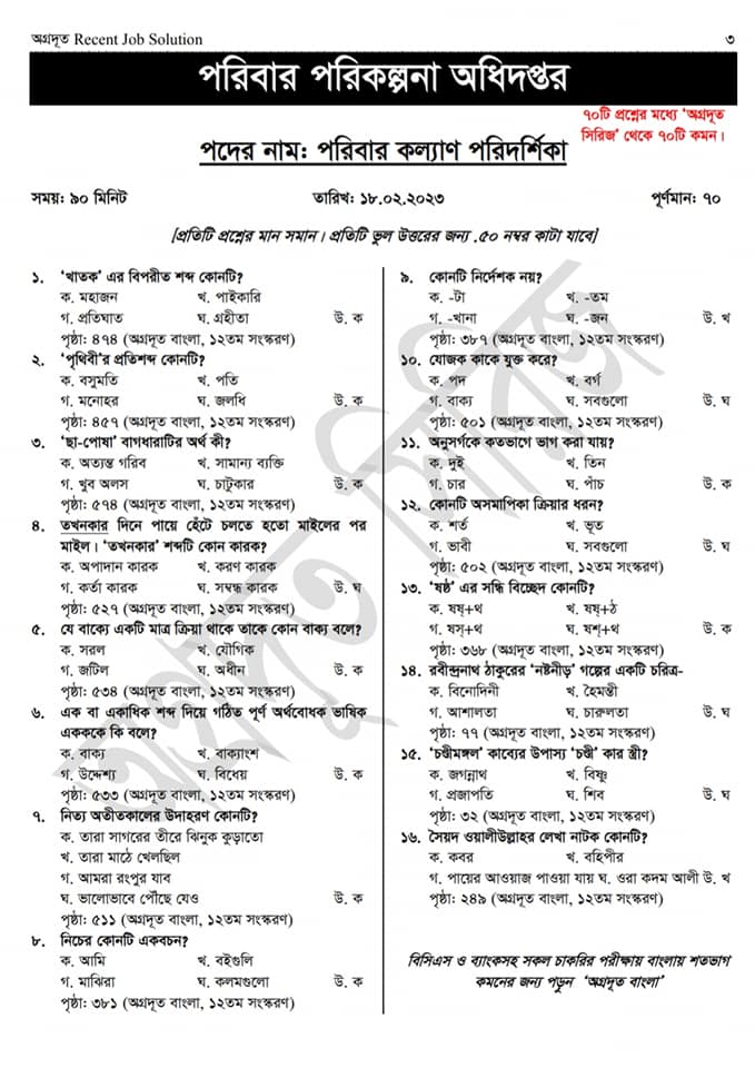 পরিবার পরিকল্পনা পরিদর্শিকা পরীক্ষার প্রশ্ন ২০২৩