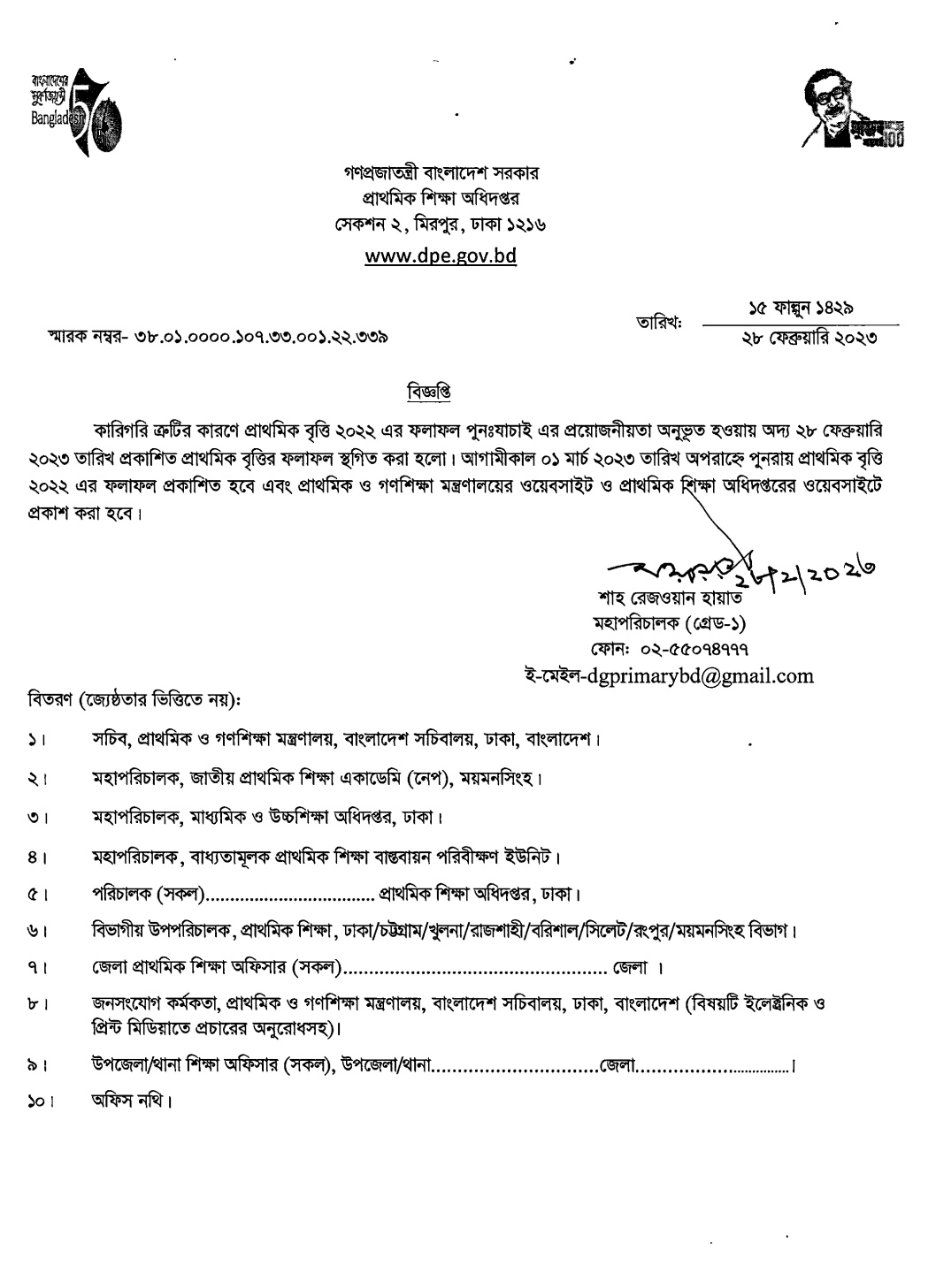 এবং সবশেষে জানা গেছে সফটওয়্যারে টেকনিক্যাল ত্রুটির কারণে তথ্যগত কিছু ভুল ধরা পড়ায় ফলাফল স্থগিত করা হয়েছে। এ বিষয়ে প্রাথমিক শিক্ষা অধিদপ্তর (ডিপিই) থেকে একটি নির্দেশনা পাঠানো হয়েছে। জানানো হয়েছে, আগামীকাল ১লা মার্চ পুনরায় বৃত্তি রেজাল্ট প্রকাশ করা হবে।