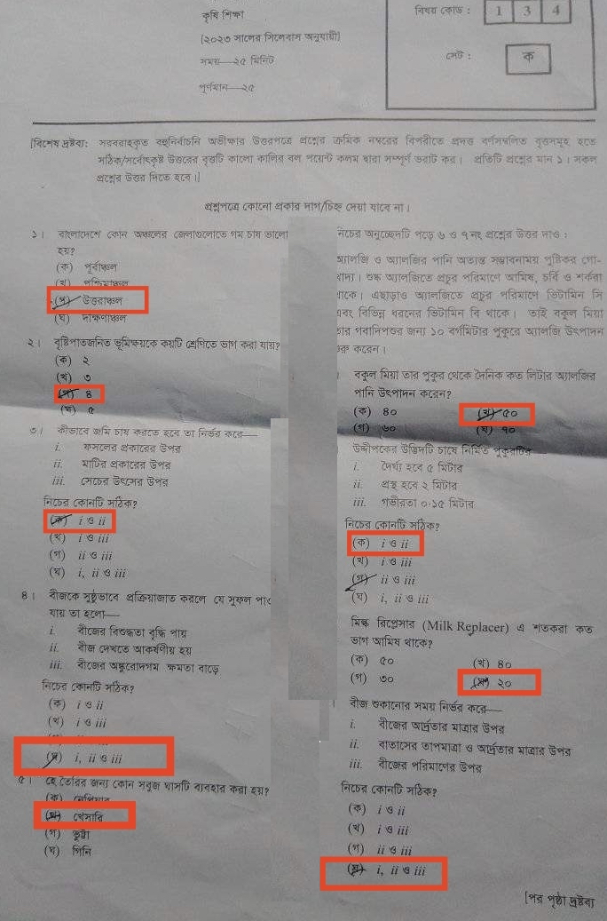 কৃষি শিক্ষা যশোর বোর্ডের ক সেটের উত্তরমালাঃ