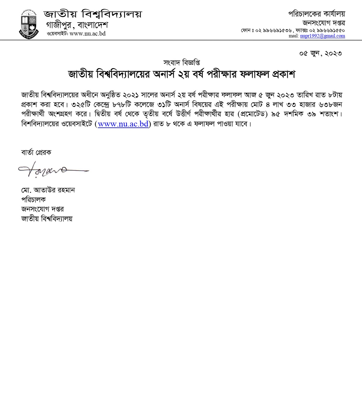 জাতীয় বিশ্ববিদ্যালয়ের অধীনে অনুষ্ঠিত ২০২১ সালের অনার্স ২য় বর্ষ পরীক্ষার ফলাফল আজ ০৫ জুন ২০২৩ তারিখে রাত ৮ টায় প্রকাশ করা হয়েছে। ৩২৫টি কেন্দ্রে ৮৭৮ টি কলেজে ৩১টি অনার্স বিষয়ের এই পরীক্ষায় মোট ৪ লাখ ৩৩ হাজার ৬৩৮ জন পরীক্ষার্থী অংশগ্রহণ করেছিল। দ্বিতীয় বর্ষ থেকে তৃতীয় বর্ষে উত্তীর্ণ পরীক্ষার্থীর হার (প্রমোটেড) ৯৫ দশমিক ৩৯ শতাংশ। জাতীয় বিশ্ববিদ্যালয়ের ওয়েবসাইট থেকে এই ফলাফল দেখা যাবে।