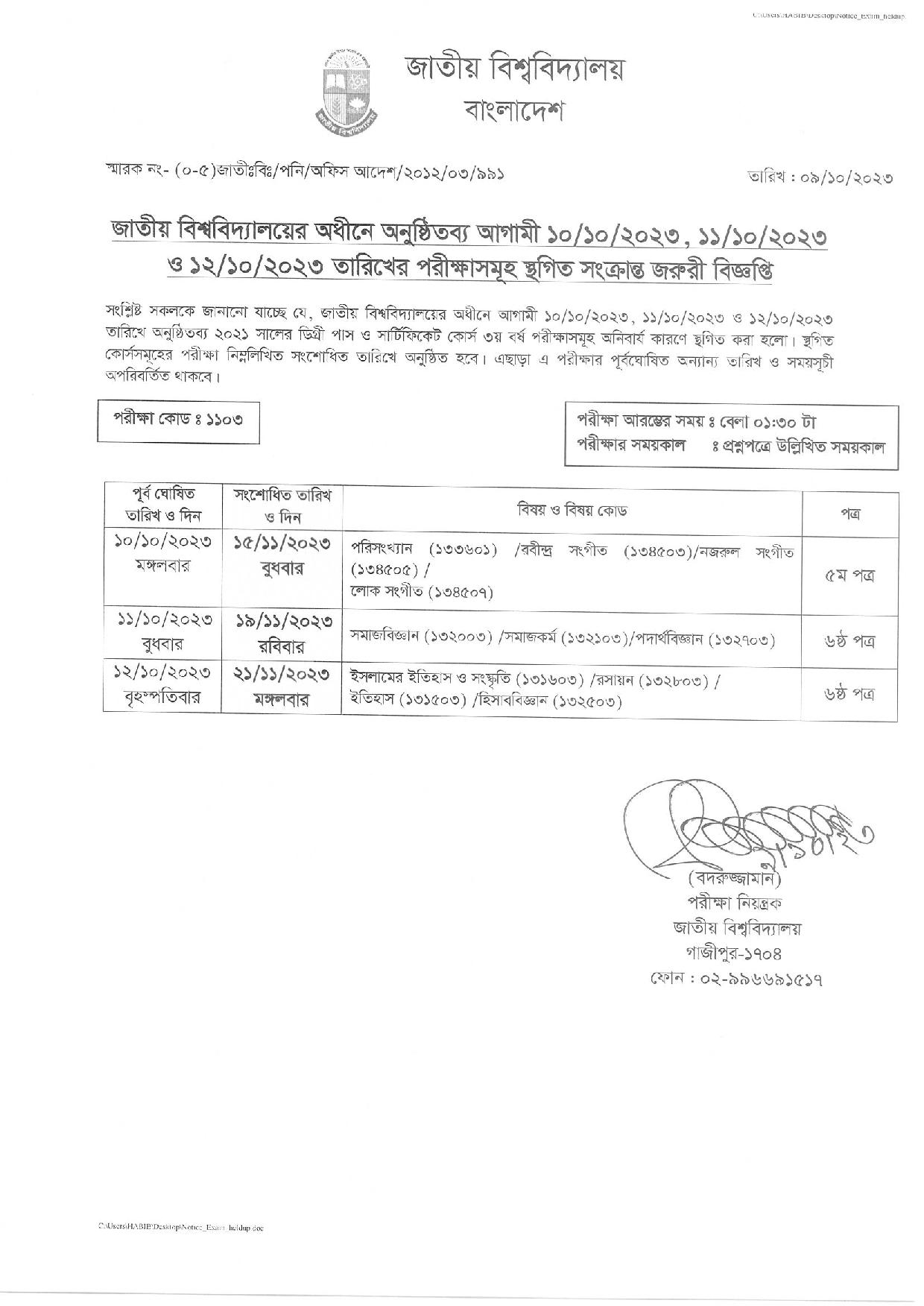 ২০২১ সালের ডিগ্রি পাস ও সার্টিফিকেট কোর্স তৃতীয় বর্ষের আগামী ১০, ১১ ও ১২ অক্টোবরের পরীক্ষা স্থগিত করা হয়েছে। স্থগিতকৃত এই পরীক্ষা যথাক্রমে আগামী ১৫, ১৯ ও ২১ নভেম্বর একই সময়ে অনুষ্ঠিত হবে। পূর্বঘোষিত অন্যান্য তারিখ ও সময়সূচি অপরিবর্তিত থাকবে ।