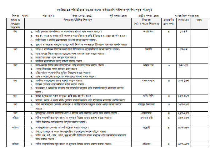 এইচএসসি বাংলা ১ম পত্র শর্ট সিলেবাস ২০২৩ PDF ডাউনলোড