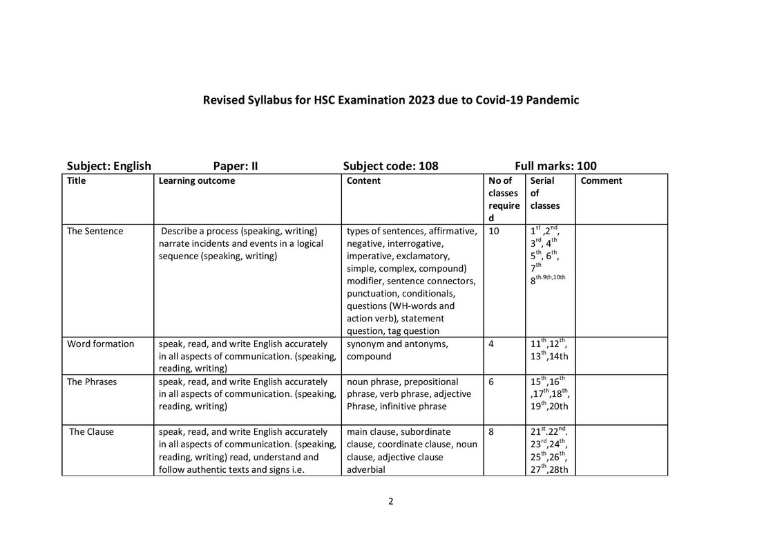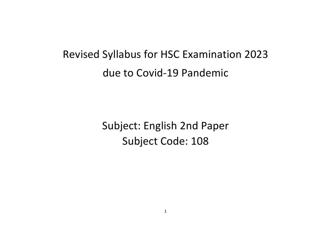 মহামারী করোনা ভাইরাসের জন্য ২০২৩ সালে অনুষ্ঠিত এইচএসসি পরীক্ষার পাঠদান কিছুটা ব্যাহত হয়েছে। যার কারণে জাতীয় শিক্ষাক্রম ও পাঠ্যপুস্তক বোর্ড (এনসিটিবি) এইচএসসি পরীক্ষার জন্য পুনর্বিন্যাসকৃত সিলেবাস প্রদান করেছেন , এনসিটিবির দেওয়া এইচএসসি ইংরেজি ২য় পত্র সিলেবাস এখানে তুলে ধরেছি।