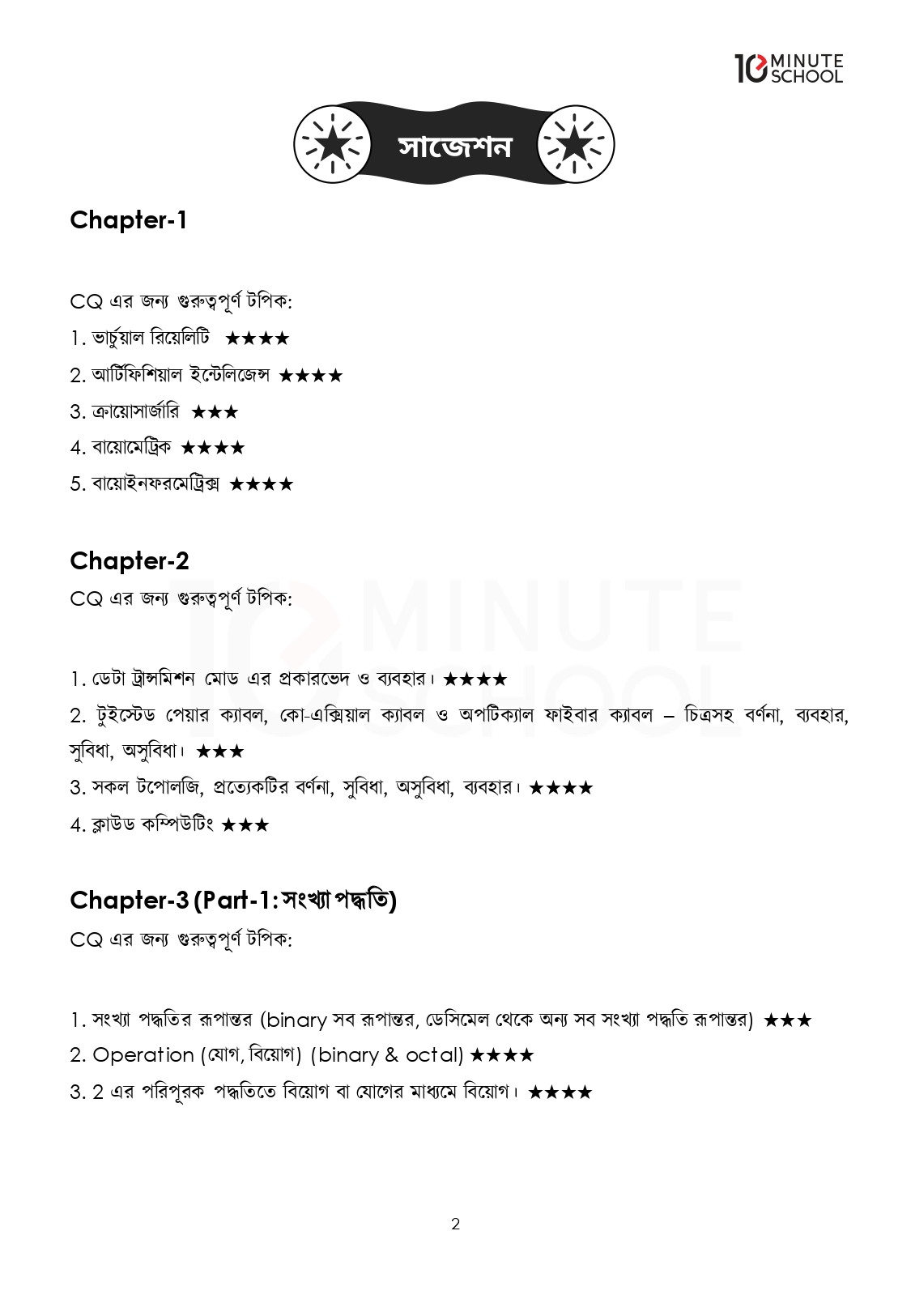 তোমরা যদি তোমাদের আইসিটি পরীক্ষার ফাইনাল ও সর্বশেষ সাজশেন পেতে চাও তাহলে তোমরা আমাদের এই পোস্টটি ফলো করতে পারো। তোমরা এখান থেকে HSC ICT পরীক্ষার সাজেশন ২০২৩ পেয়ে যাবে। তোমরা চাইলে আমাদের এই পোস্ট থেকে তথ্য ও যোগাযোগ প্রযুক্তি সাজেশন ২০২৩ পিডিএফ ডাউনলোড করতে পারবে। টেন মিনিট স্কুল তোমাদের জন্য ফাইনাল ও সর্বশেষ প্রস্তুতির জন্য কিছু সাজেশন তৈরি করেছে এই সাজেশন গুলো তোমরা ফলো করতে পারো।