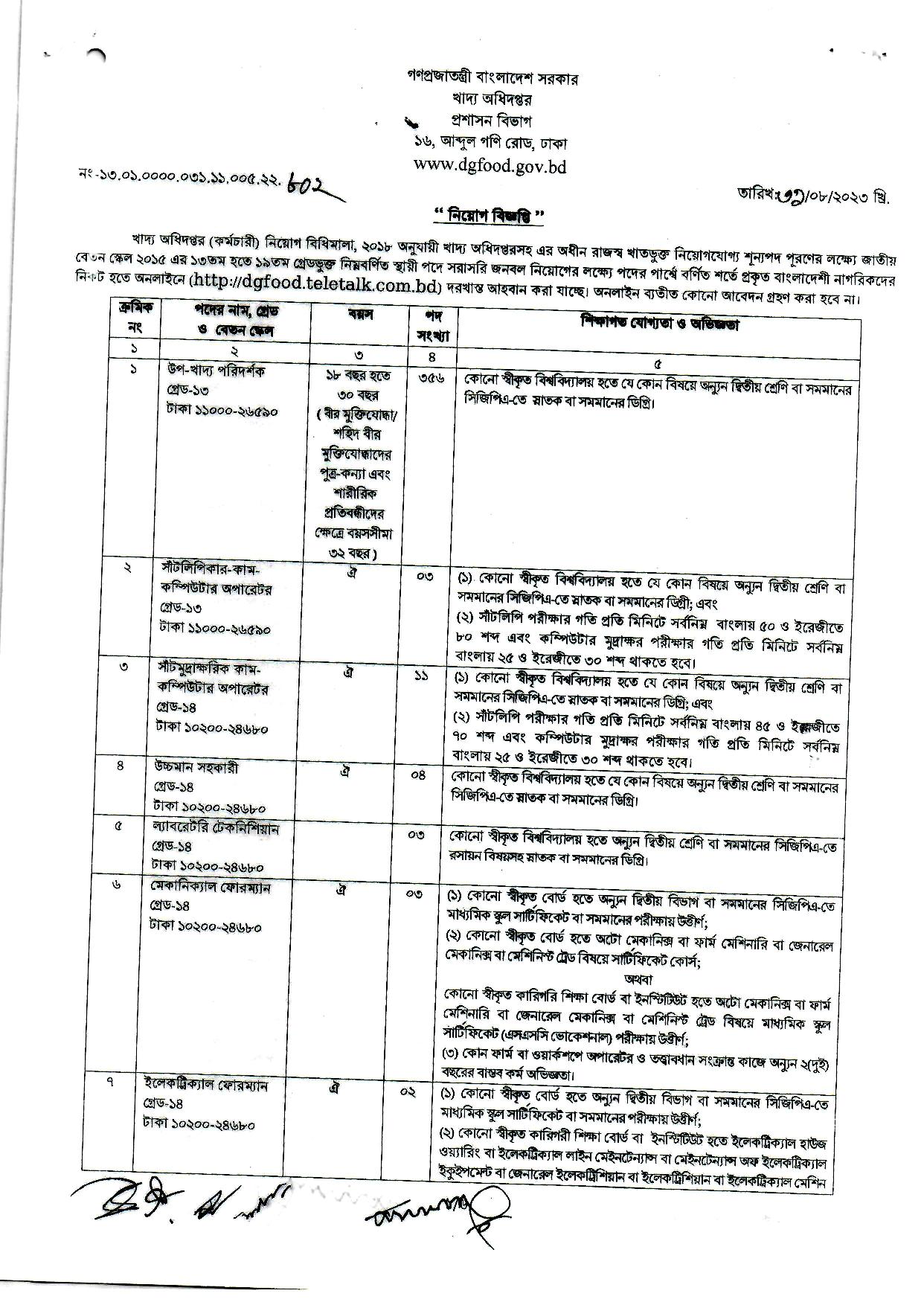 খাদ্য অধিদপ্তর নিয়োগ বিজ্ঞপ্তি ২০২৩