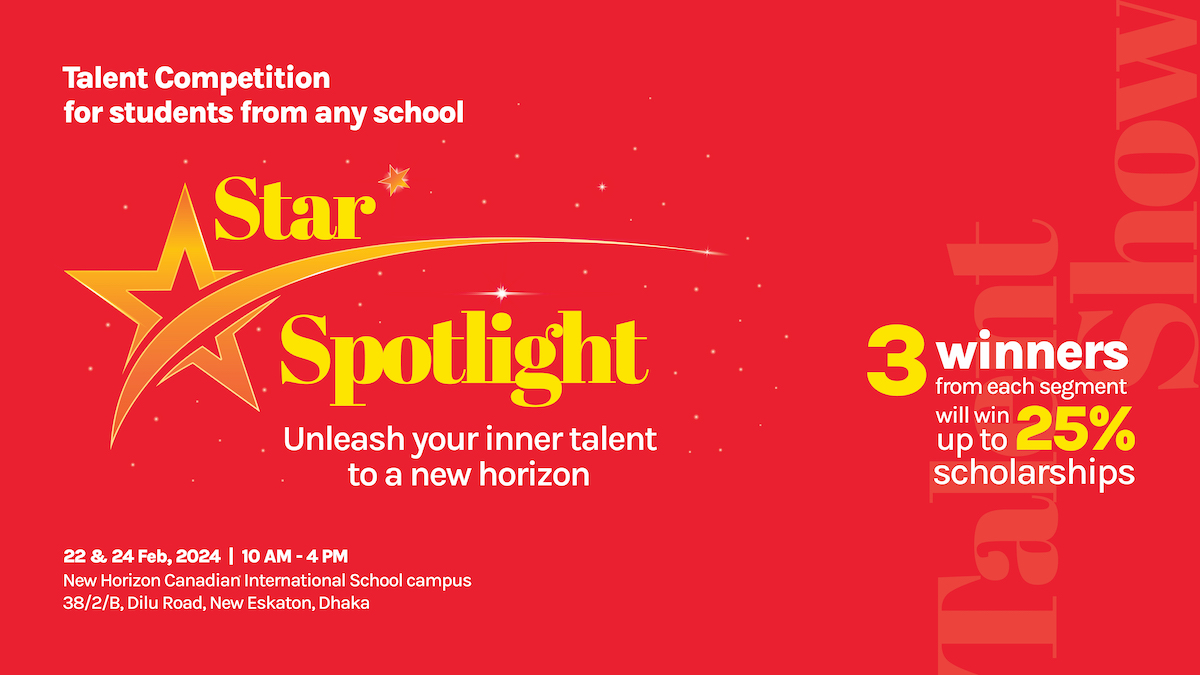 শিশুদের প্রতিভা সকলের সামনে তুলে ধরতে ‘স্টার স্পটলাইট’ প্রতিযোগিতার আয়োজন করতে যাচ্ছে নিউ হরাইজন কানাডিয়ান ইন্টারন্যাশনাল স্কুল। আগামী ২২ ও ২৪ ফেব্রুয়ারি বেলা ১০টা থেকে বিকাল ৪টা পর্যন্ত এই প্রতিযোগিতা আয়োজিত হবে। এতে চিত্রাঙ্কন, নাচ, সঙ্গীত, কবিতা, গণিত, বৈজ্ঞানিক উদ্ভাবনের মতো আরও নানান বিষয়ে নিজেদের প্রতিভা প্রদর্শনের সুযোগ পাবে ২ থেকে ৮ বছর বয়সী শিশুরা।