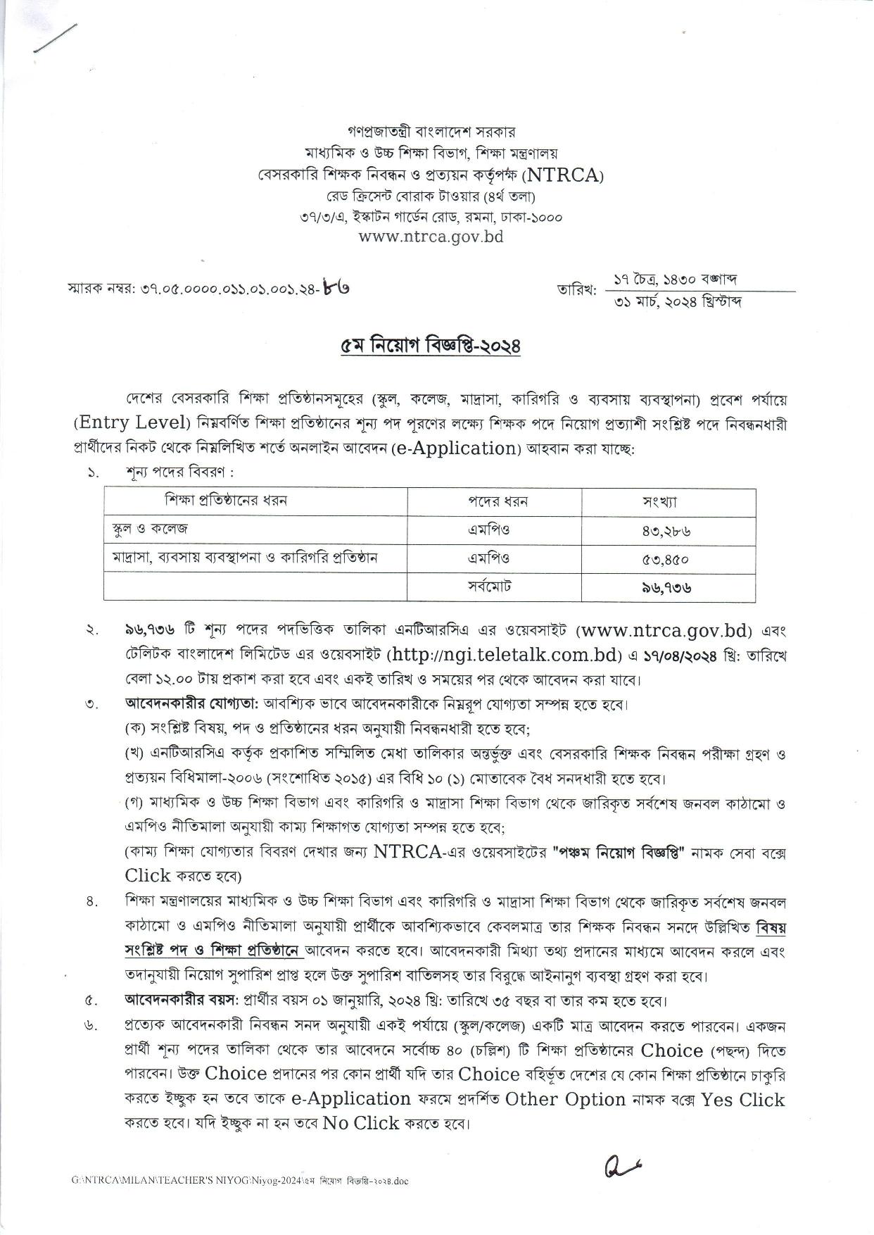 | ৫ম গণবিজ্ঞপ্তি ২০২৪ | এনটিআরসিএ (NTRCA) |