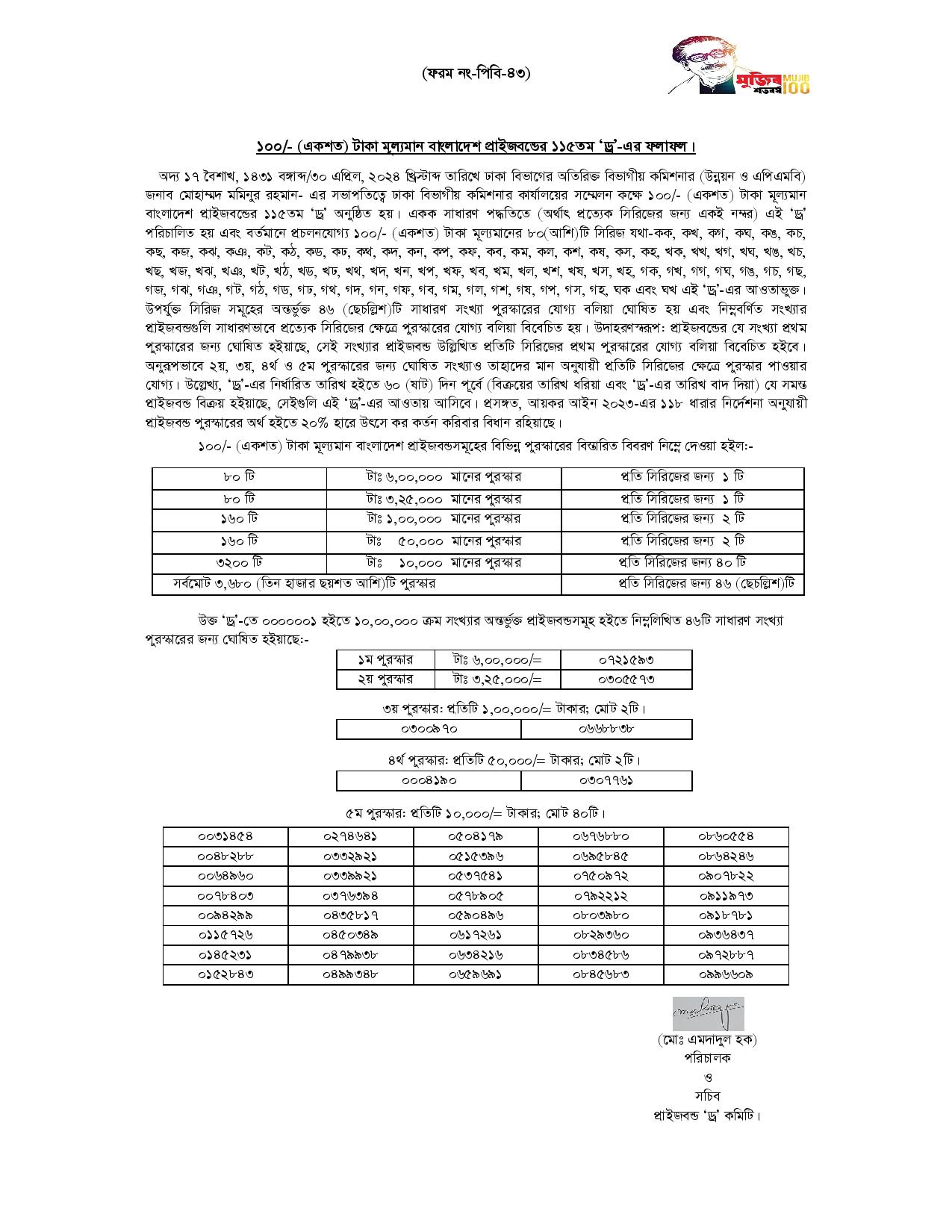 প্রাইজবন্ড ড্র ২০২৪ ফলাফল ১১৫