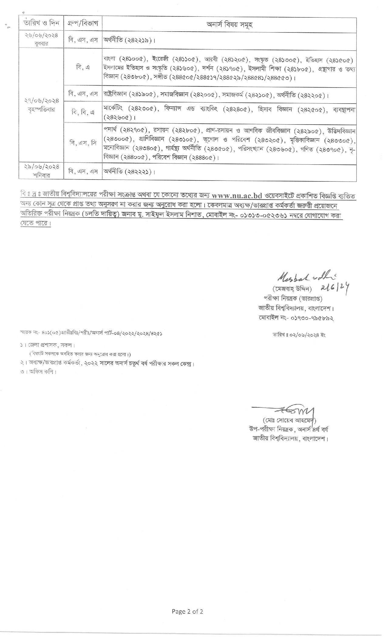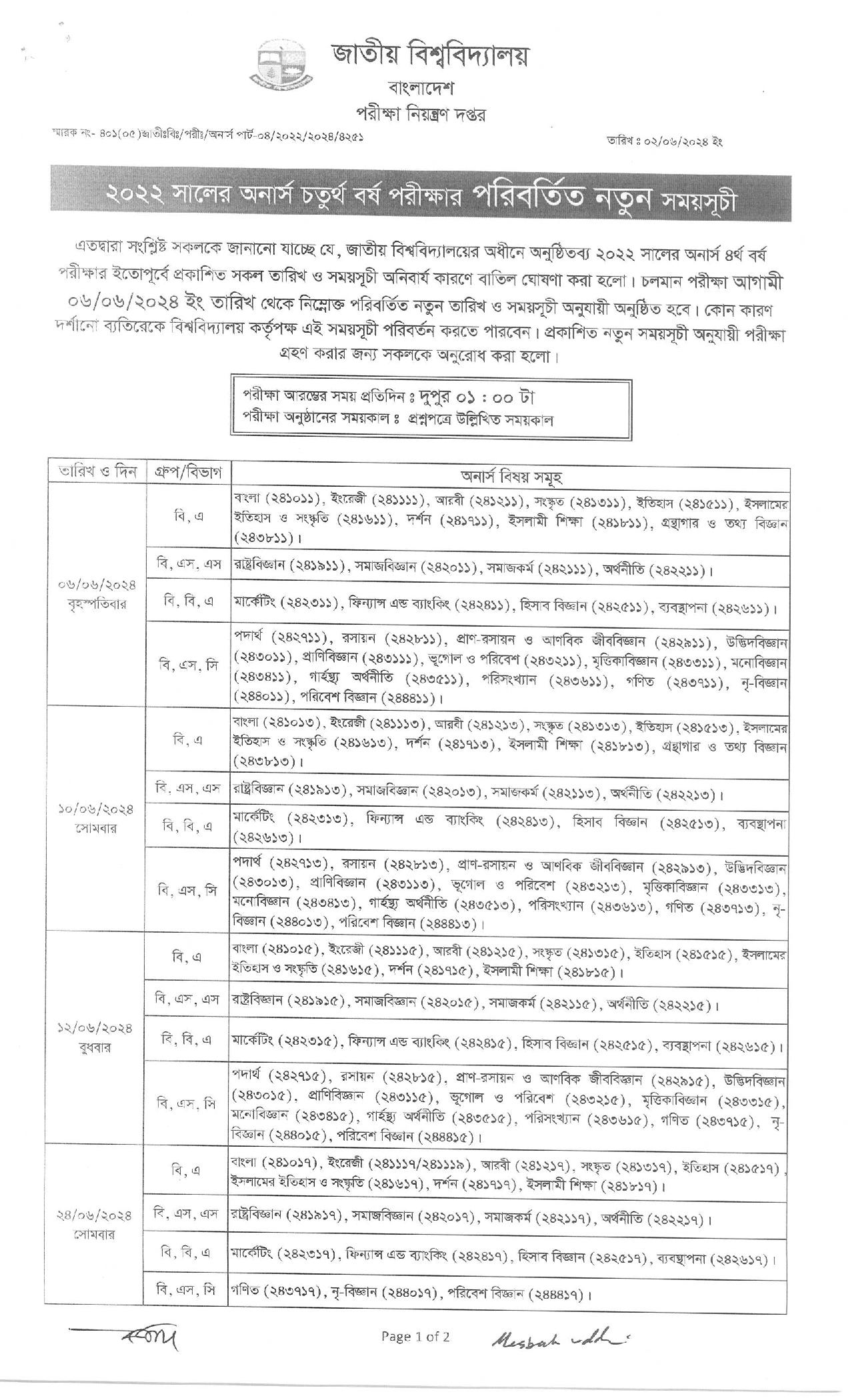 অনার্স ৪র্থ বর্ষের সংশোধিত রুটিন ২০২৪