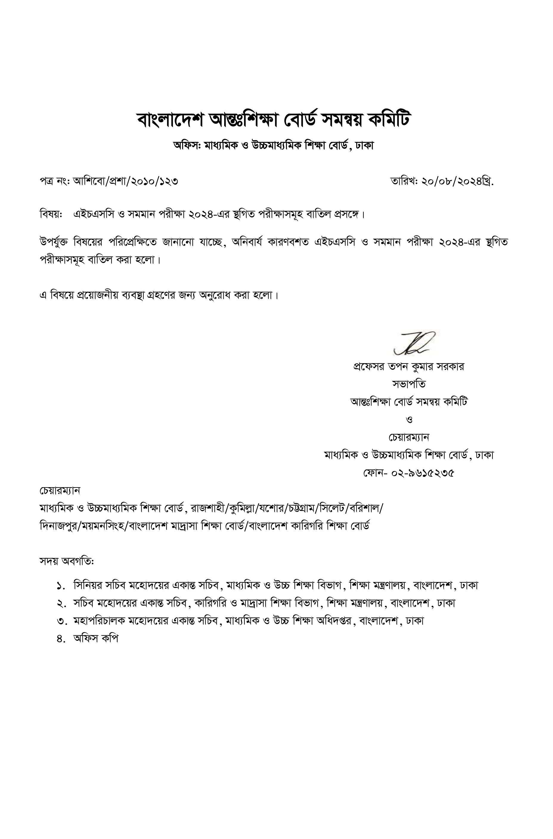 উল্লেখ্য, সারা দেশে এবারের এইচএসসি ও সমমানের পরীক্ষা ৩০ জুন তারিখে শুরু হয়ে ১১ আগস্ট শেষ হওয়ার কথা ছিলো । কোটা সংস্কার আন্দোলন ঘিরে সহিংসতার কারণে গত ১৮, ২১, ২৩ ও ২৫, ২৮ জুলাই ও ১ ও ৪ আগস্টের পরীক্ষা স্থগিত করা হয়। সর্বশেষে ১১ আগস্ট থেকে পরীক্ষা অনুষ্ঠিত হওয়ার কথা ছিলো।