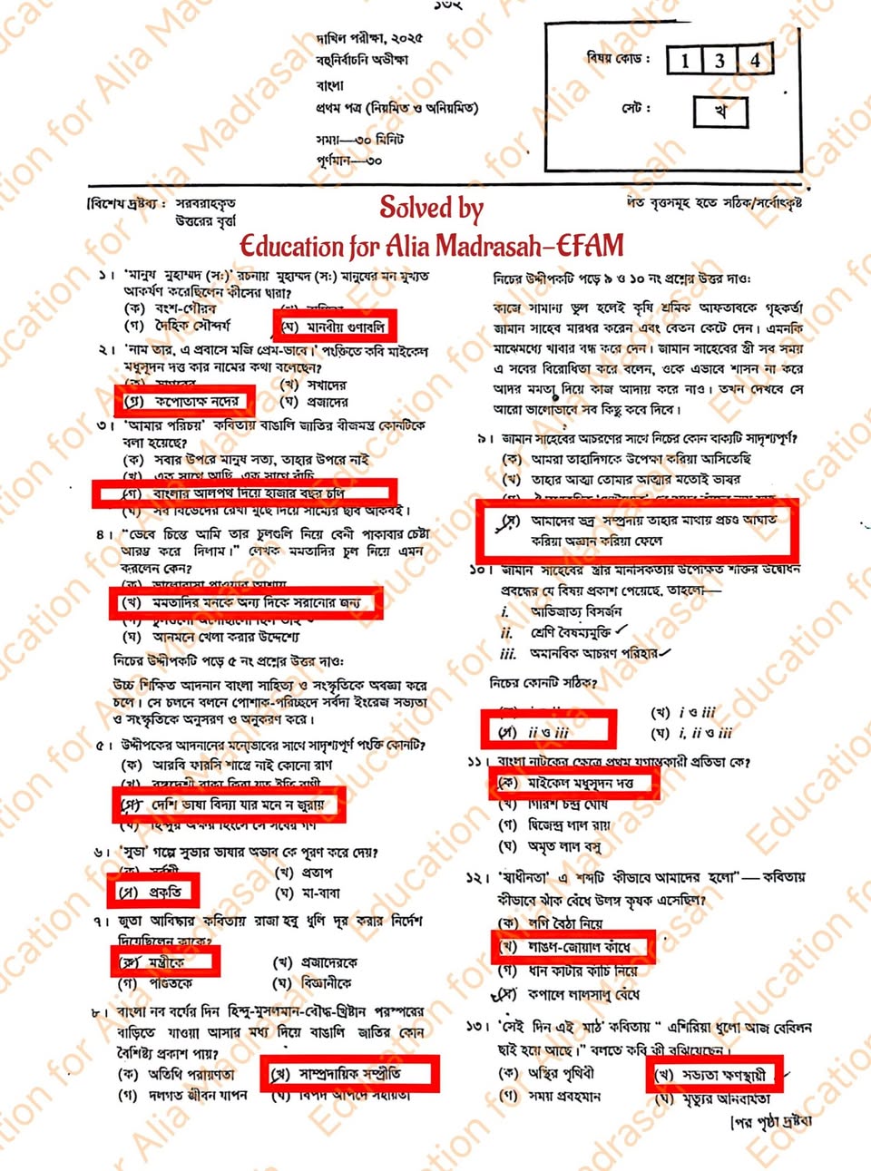 দাখিল বাংলা ১ম পত্র পরীক্ষার উত্তর ২০২৫