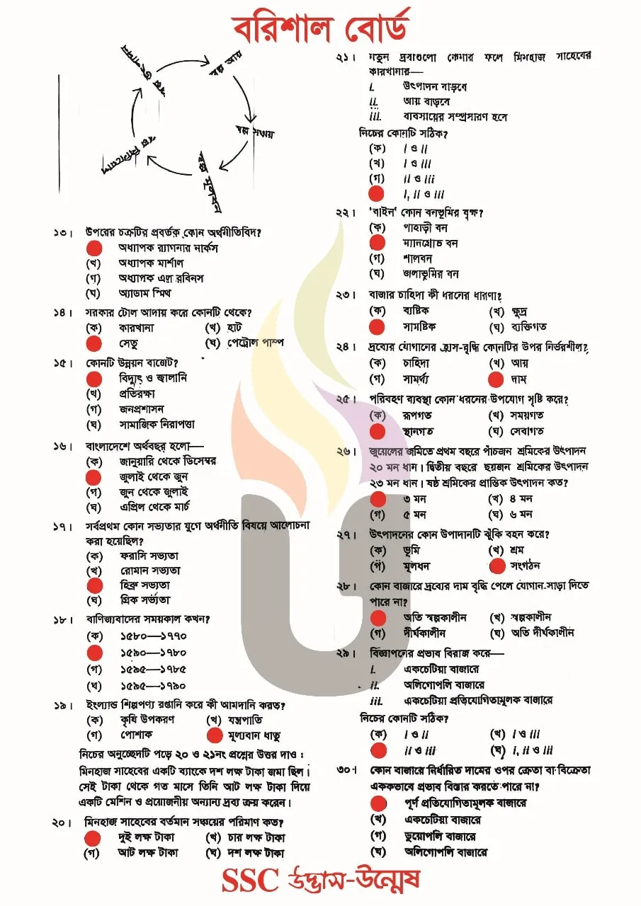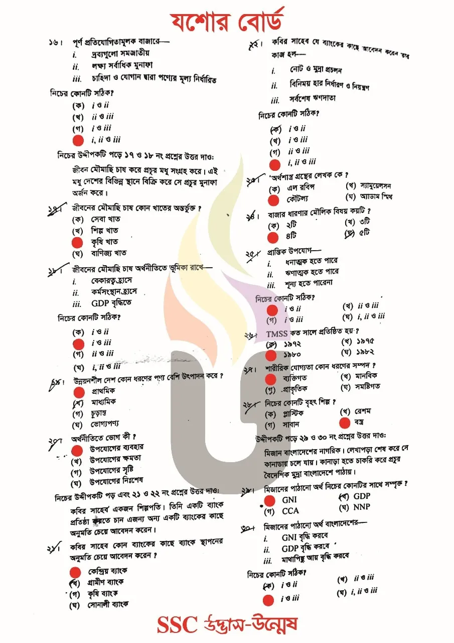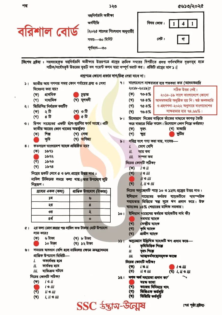 Barguna District, Barisal District, Bhola District, Jhalokati District, Patuakhali District and Pirojpur District districts under Jashore Education Board. So, If you are from these 6 districts then your Economics Question Answer of SSC Exam 2025 will be found here.