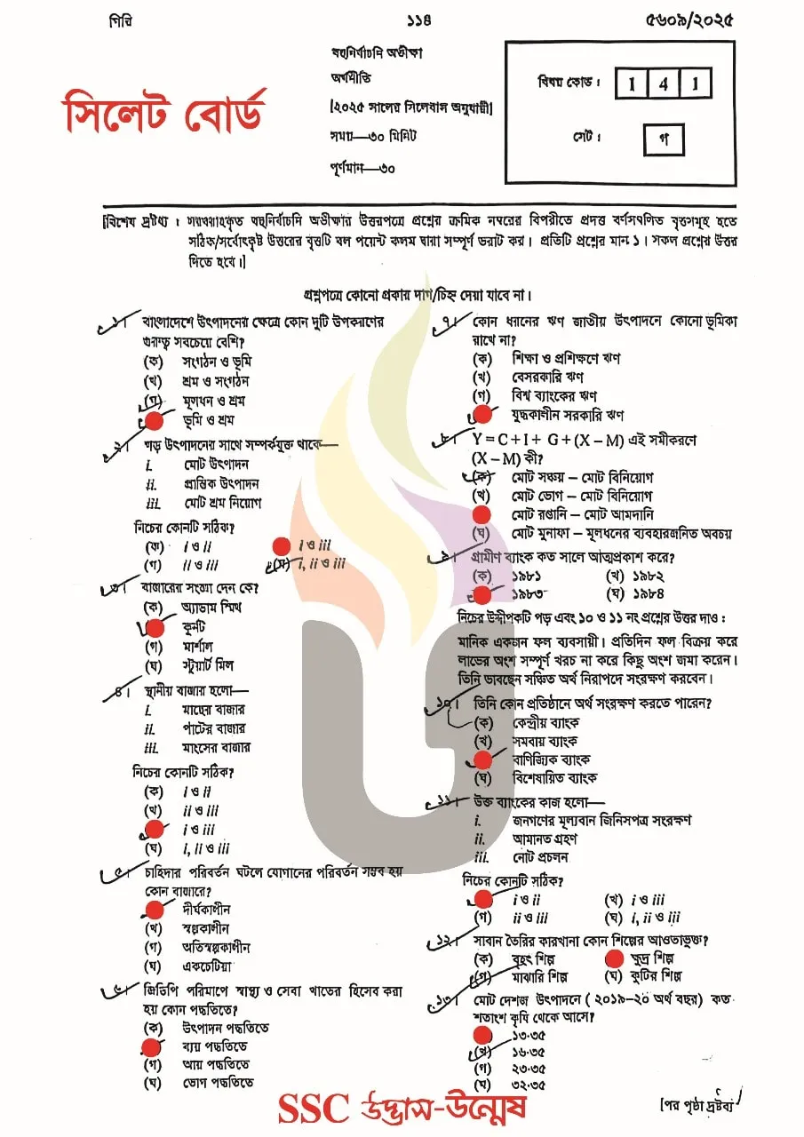 SSC Means Secondary School Certificate Exam, Economics Means Orthoniti & MCQ Means multiple-choice question. In this post you will find Economics MCQ Question Solve 2025. Economics Subject Code is 141. In this exam students have to Answer 30 MCQ Type Questions within 30 Minutes. Students have to Carefully fill up the OMR sheet with Exam Year, Roll Number, Registration Number, Subject Code, Set Code & Correct Answer.