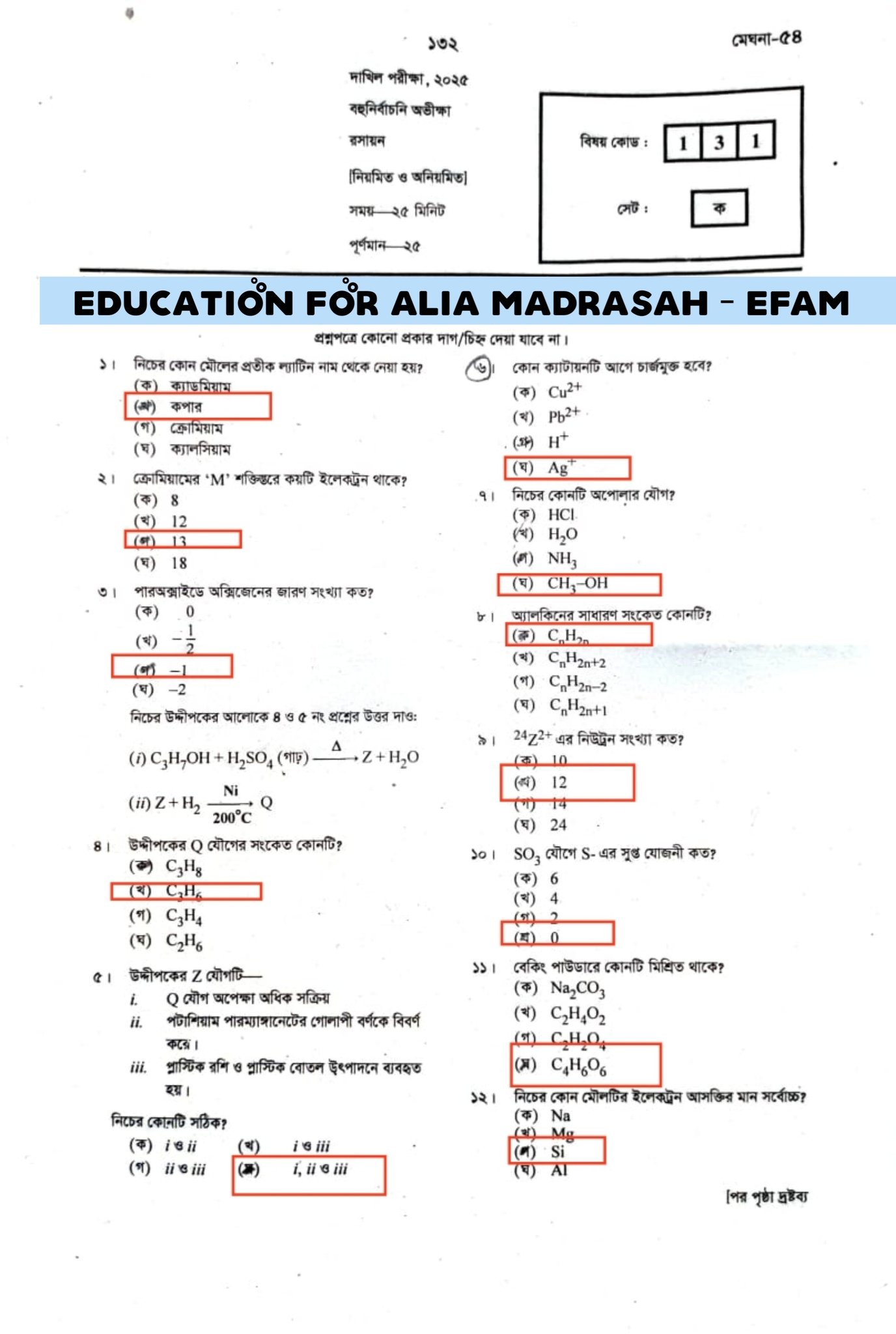 দাখিল রসায়ন বহুনির্বাচনি প্রশ্ন ২০২৫