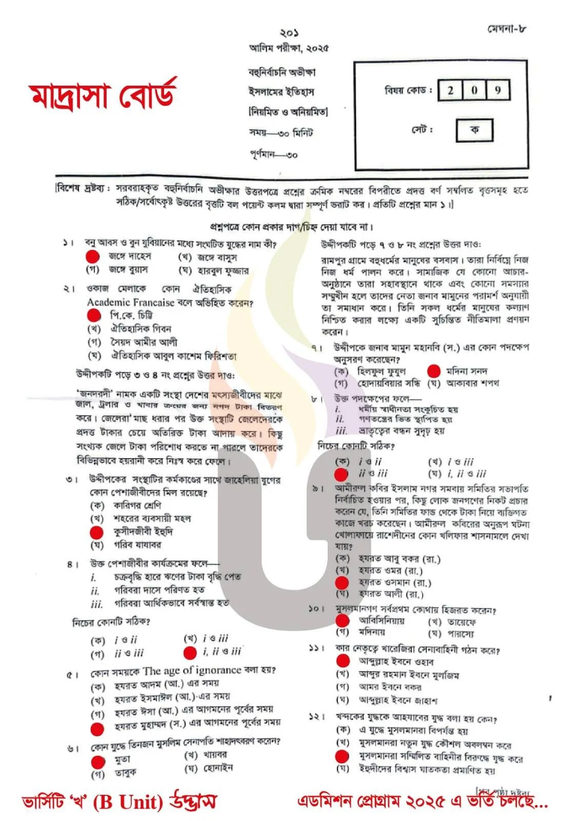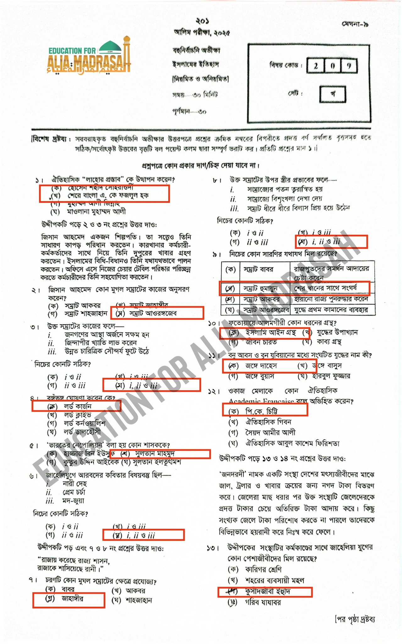 Alim Exam Means Secondary School Certificate Equivalent Exam in Madrasah Education Board, Islamic History Means Islamer Itihas & MCQ Means multiple-choice question. In this post you will find Islamic History MCQ Question Solve 2025. Islamic History Subject Code is 209. In this exam students have to Answer 30 MCQ Type Questions within 30 Minutes. Students have to Carefully fill up the OMR sheet with Exam Year, Roll Number, Registration Number, Subject Code, Set Code & Correct Answer.