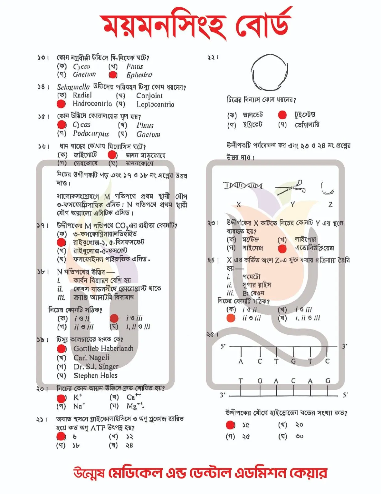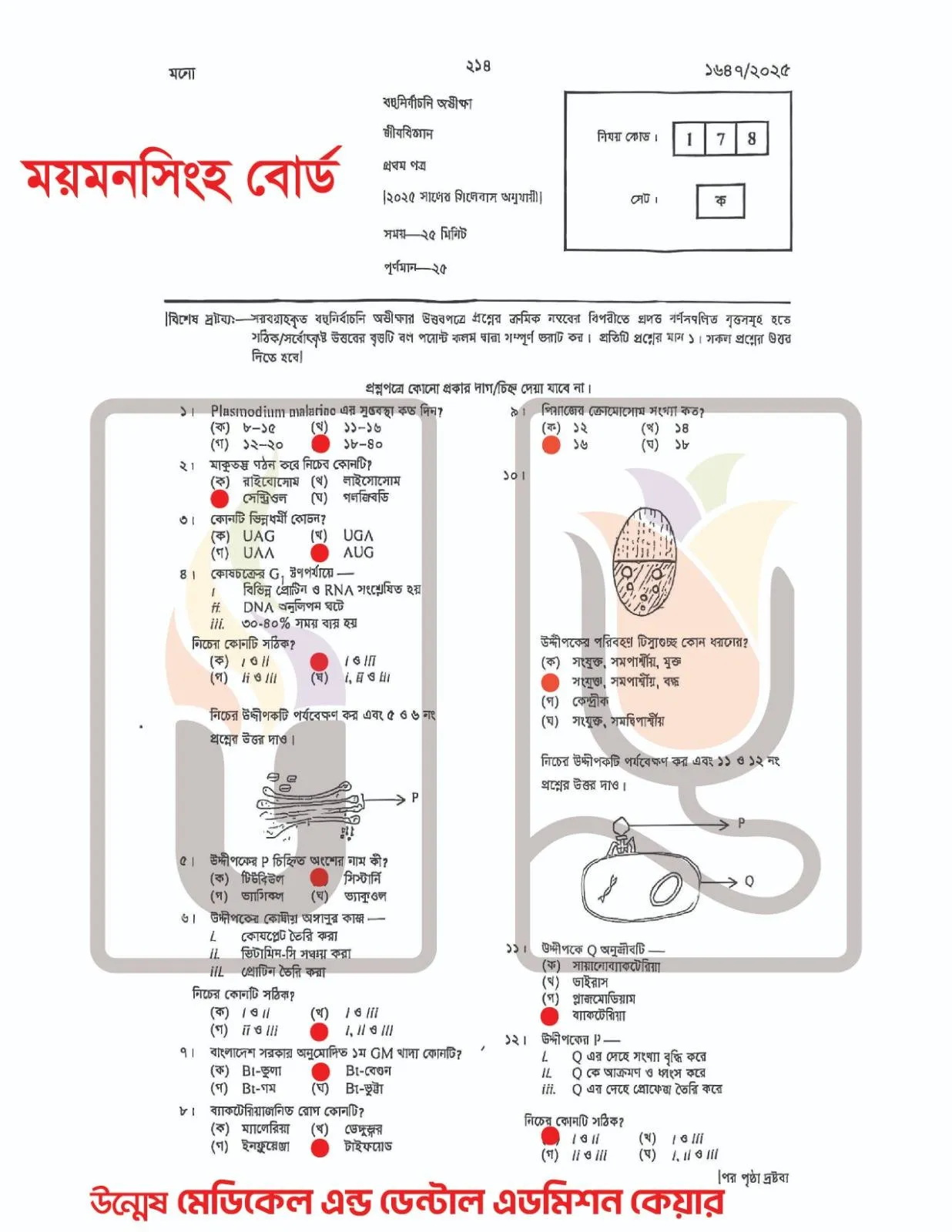 ময়মনসিংহ বোর্ড এইচএসসি জীববিজ্ঞান ১ম পত্র MCQ প্রশ্ন সমাধান ২০২৫