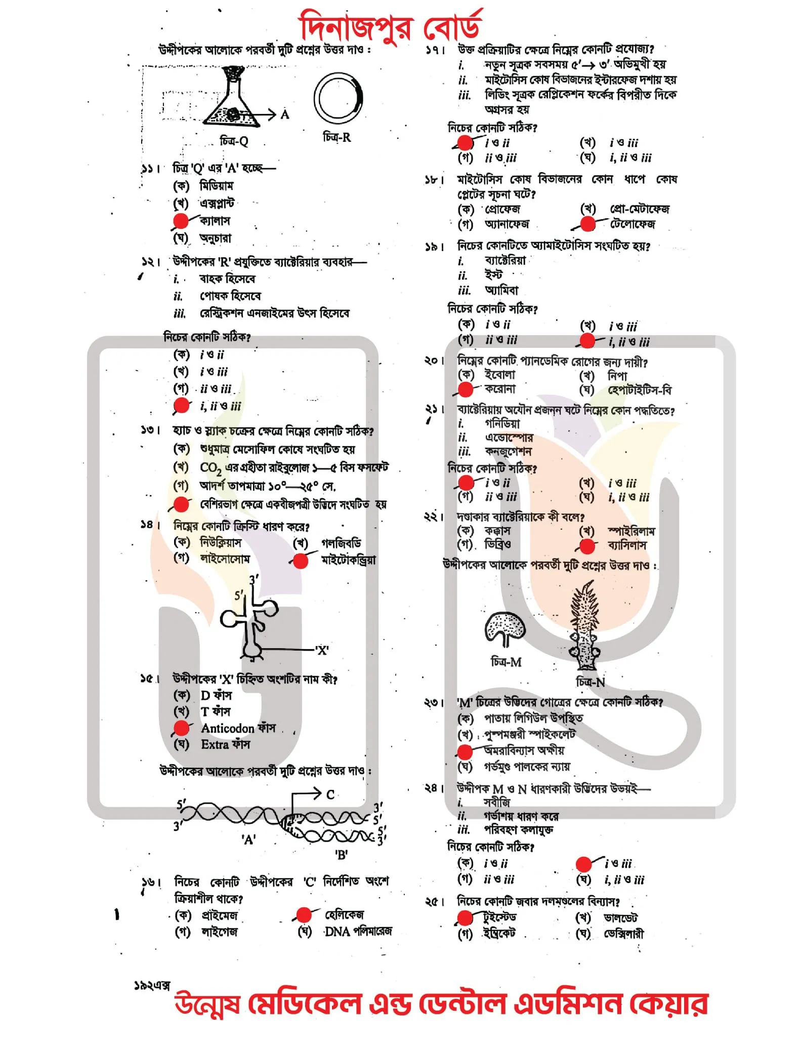 দিনাজপুর বোর্ড এইচএসসি জীববিজ্ঞান ১ম পত্র MCQ প্রশ্ন সমাধান ২০২৫