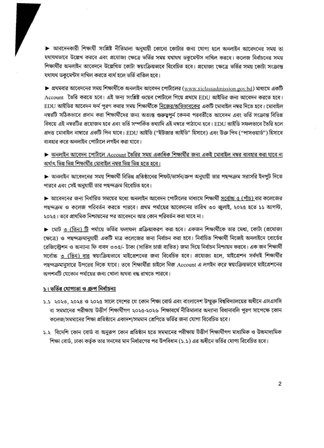 ২য় পর্যায়ের আবেদনের সময়সীমাঃ ২৩ আগস্ট থেকে ২৫ আগস্ট ২০২৫ তারিখ (যেসকল শিক্ষার্থী ইতিপূর্বে ভর্তির জন্য কোন শিক্ষা প্রতিষ্ঠানে নির্বাচিত (Selected) হয়নি –তারা কোন প্রকার ফি প্রদান ছাড়াই তাদের আবেদন update (নতুন কলেজ সংযোজন/বিয়োজন) করতে পারবে। যারা ইতিপূর্বে ভর্তির জন্য আবেদন করেনি অথবা ভর্তির জন্য নির্বাচিত (Selected) হয়েও ভর্তি নিশ্চায়ন করেনি –তারা আবেদন ফি পুনারায় (Teletalk / Rocket / Surecash এর মাধ্যমে) জমা দিয়ে আবেদন করতে পারবে এবং যারা পূর্বে আবেদন ফি জমা দিয়েছে কিন্তু আবেদন করেনি, তারা ও আবেদন করতে পারবে।)