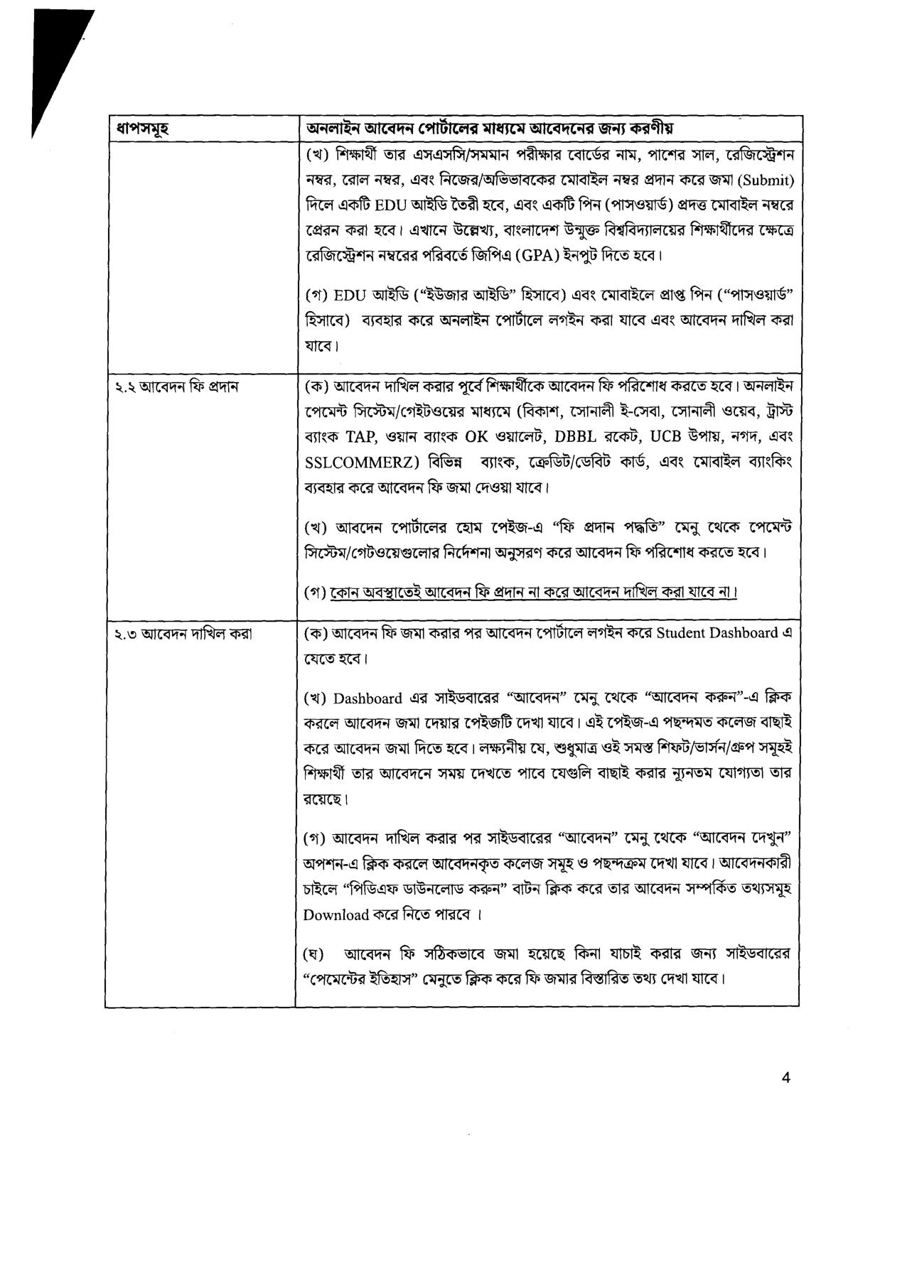 আবেদন ফিঃ অনলাইনে আবেদনের ক্ষেত্রে সর্বনিম্ন ৫ টি কলেজে আবেদন করলেও ২২০/- টাকা আবার ১০টি কলেজে আবেদন করলেও ২২০/- টাকা চার্জ করবে।