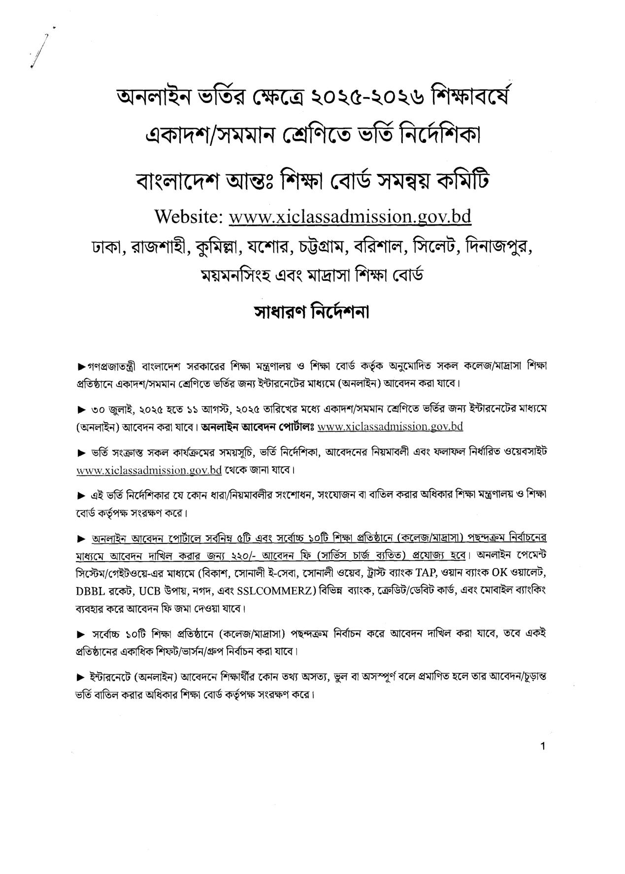 ২০২৫-২৬ শিক্ষাবর্ষে একাদশ শ্রেণিতে ভর্তির নীতিমালা ২০২৫ৎ