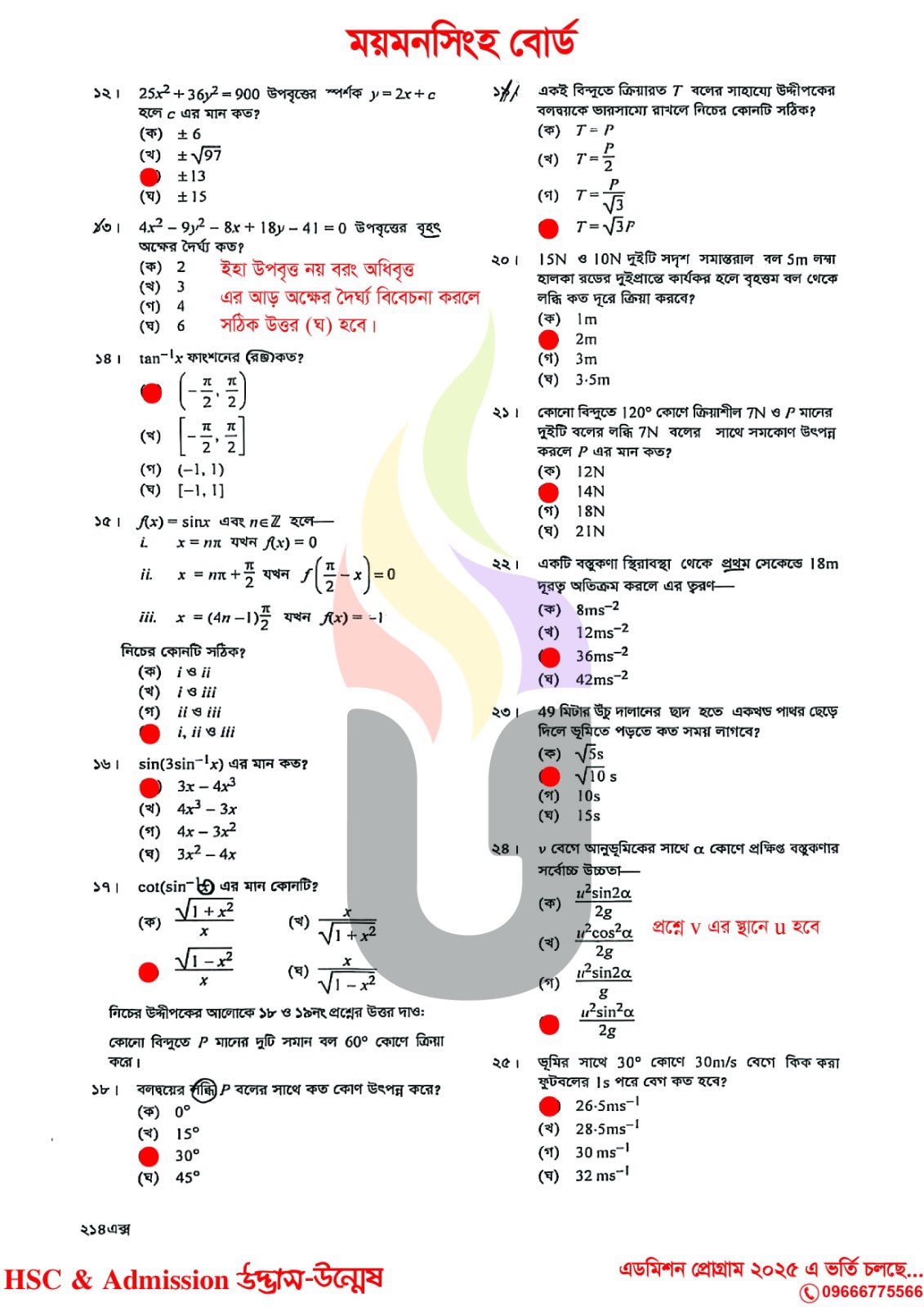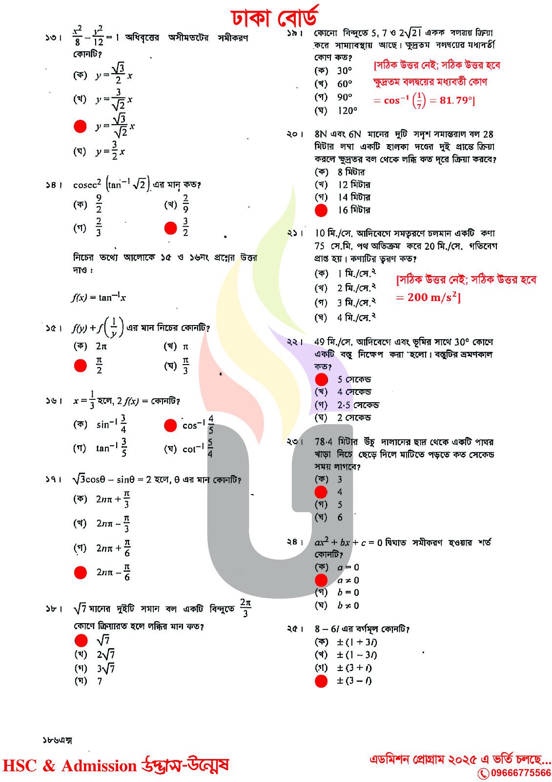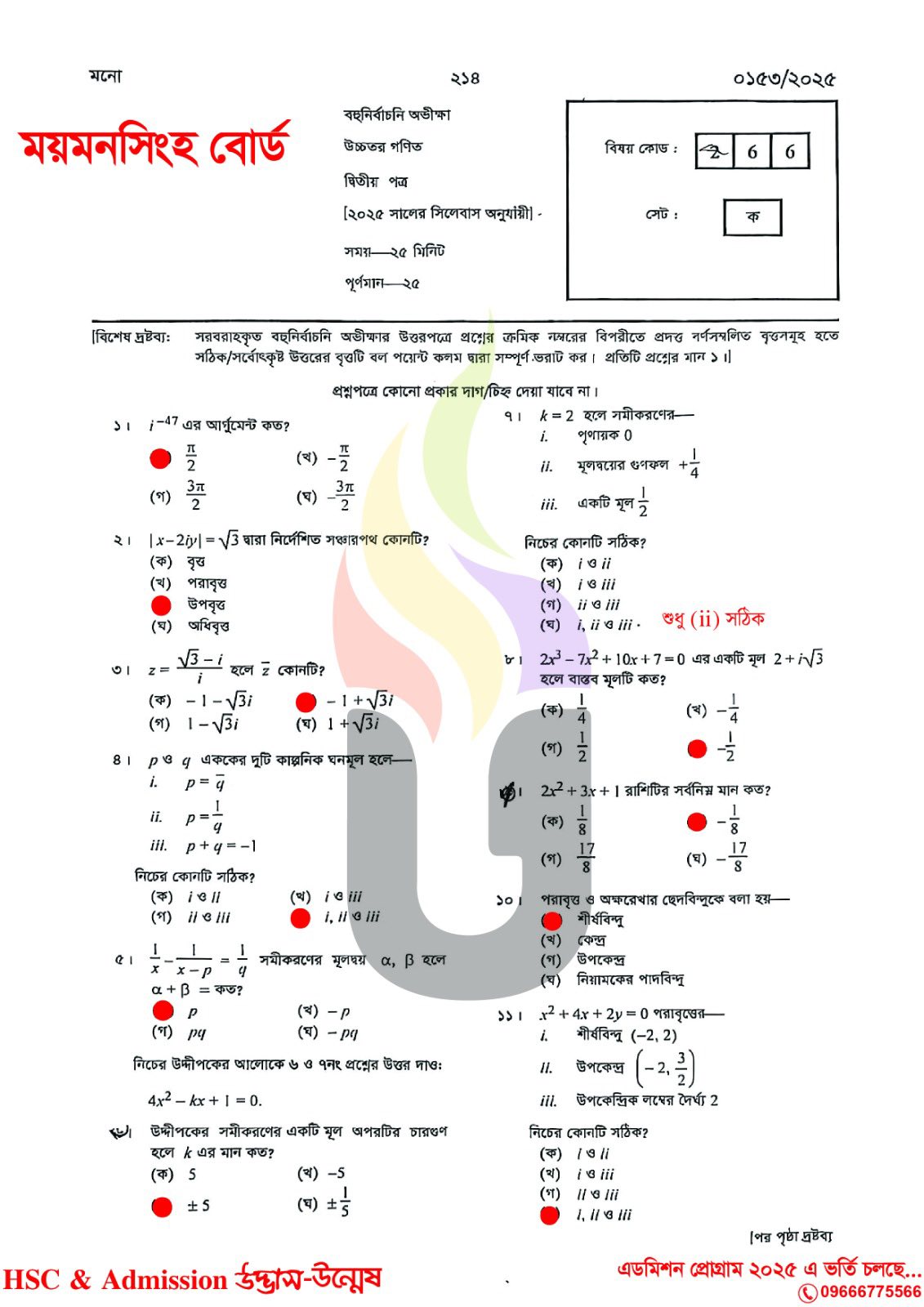 এইচএসসি ২০২৫ উচ্চতর গণিত ২য় পত্র MCQ উত্তরমালা