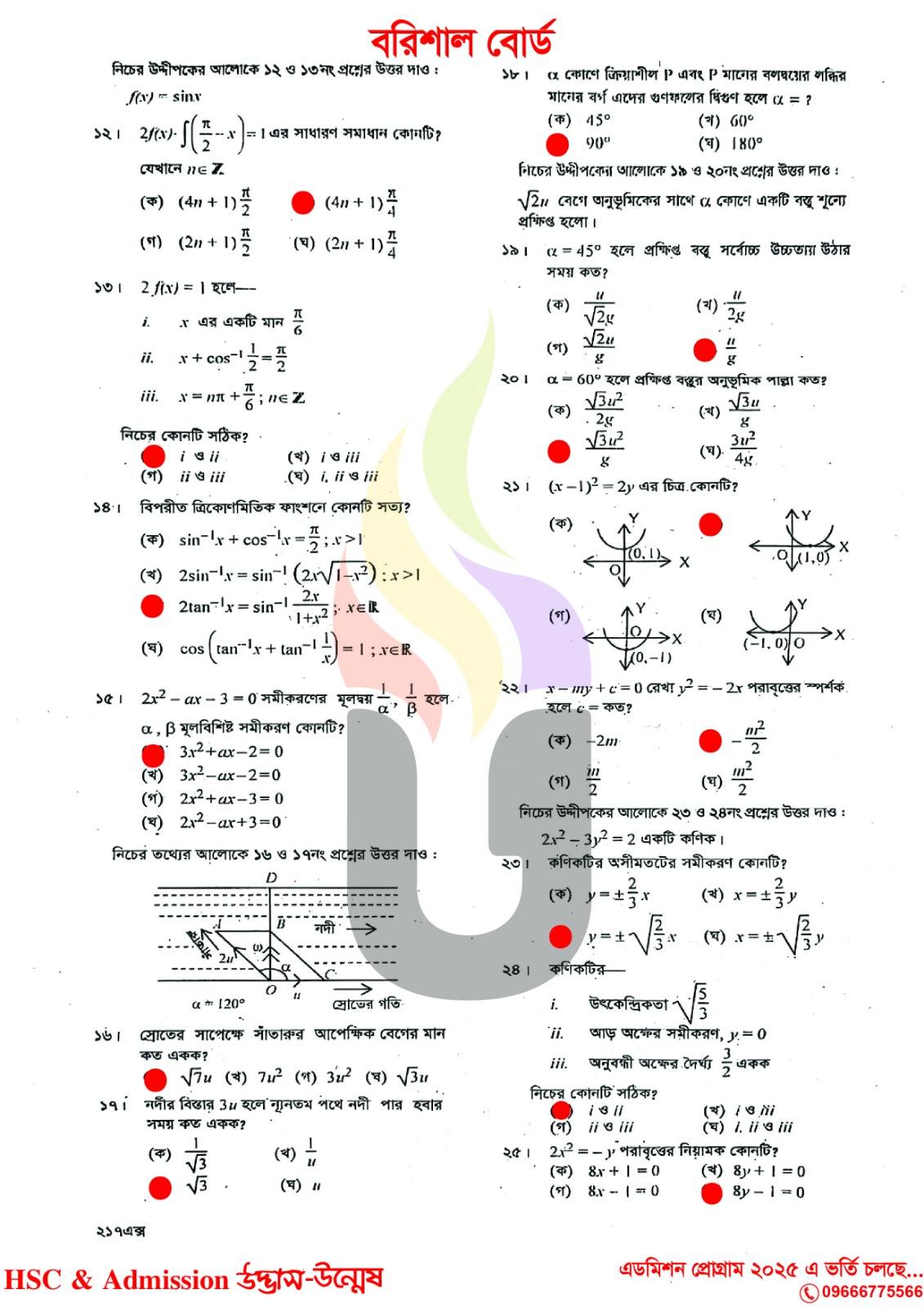 বরিশাল বোর্ড এইচএসসি উচ্চতর গণিত ২য় পত্র MCQ প্রশ্ন সমাধান ২০২৫