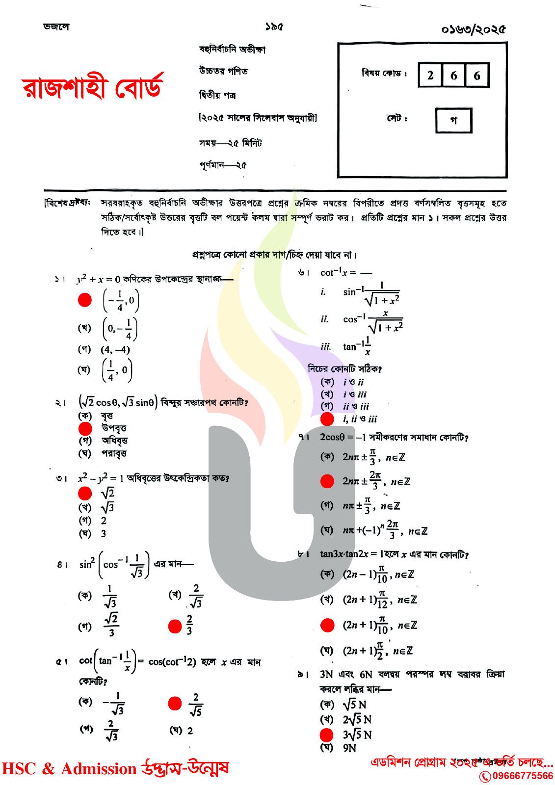 রাজশাহী বোর্ড এইচএসসি উচ্চতর গণিত ২য় পত্র এমসিকিউ প্রশ্ন সমাধান ২০২৫