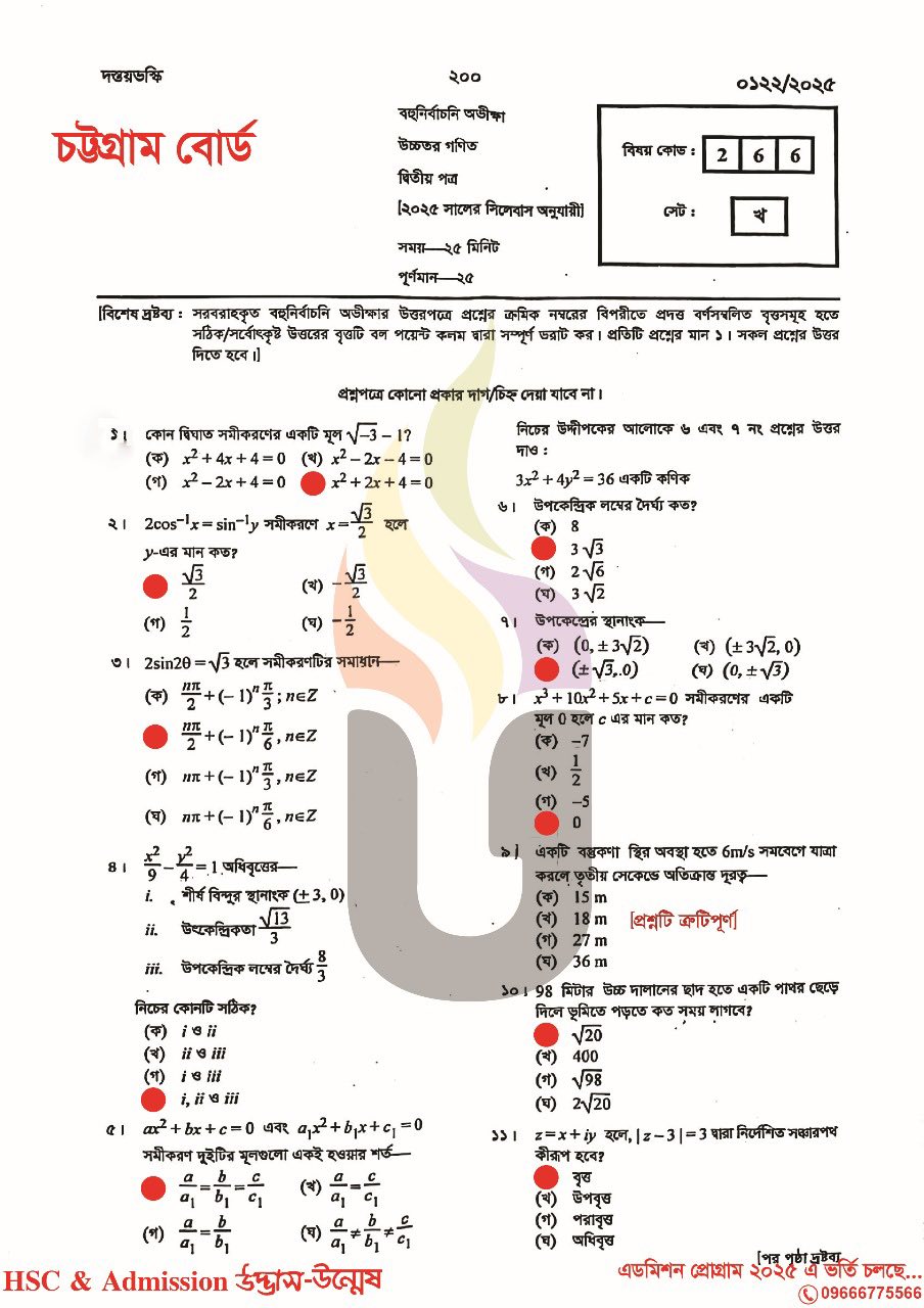 চট্টগ্রাম বোর্ড এইচএসসি উচ্চতর গণিত ২য় পত্র প্রশ্ন সমাধান ২০২৫