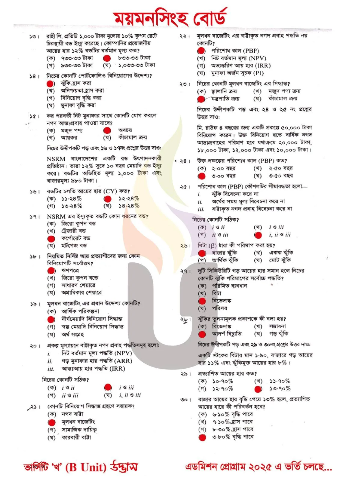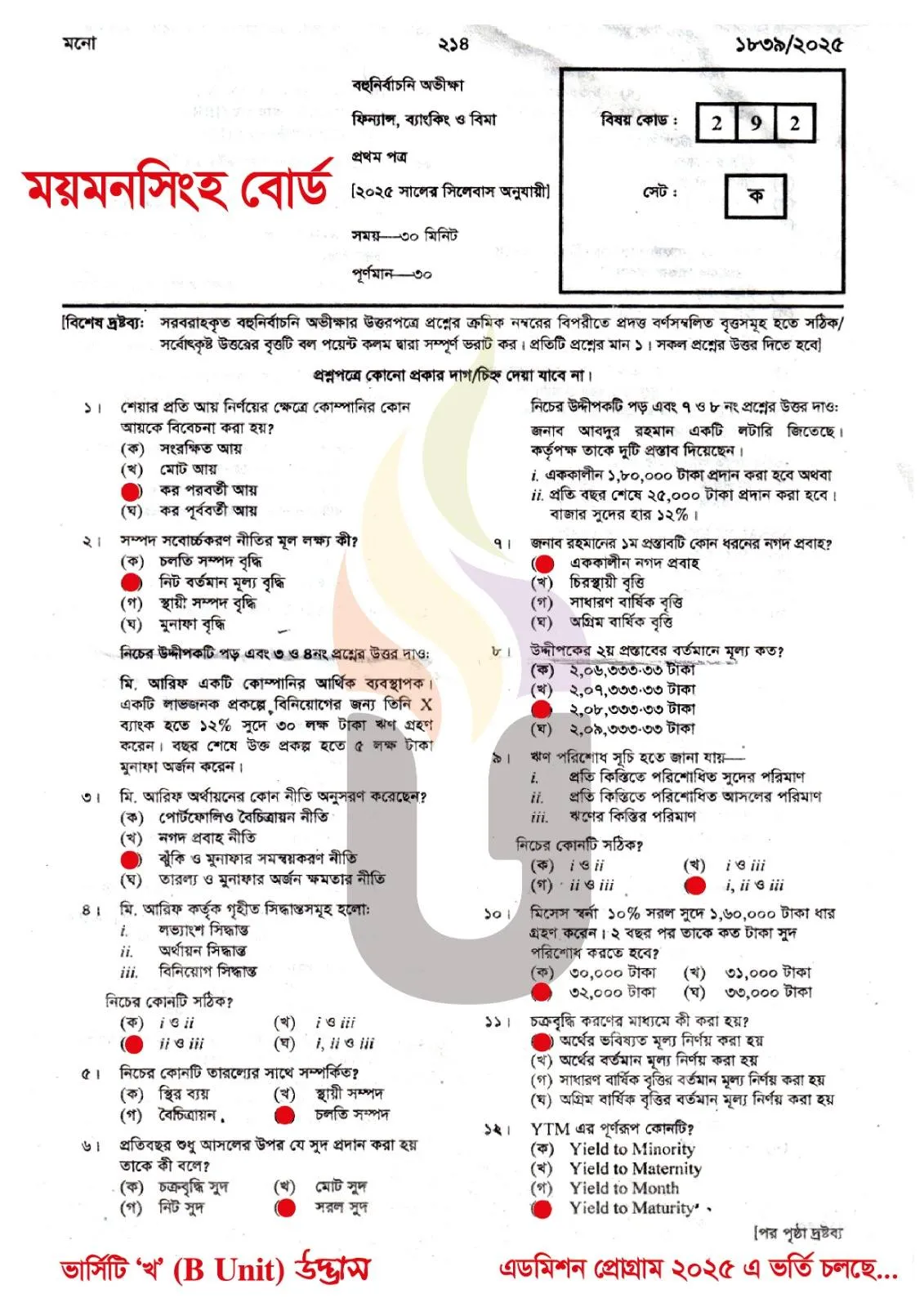 Finance Banking and Insurance 1st Paper MCQ Exam Question Solution Mymensingh Board HSC 2025