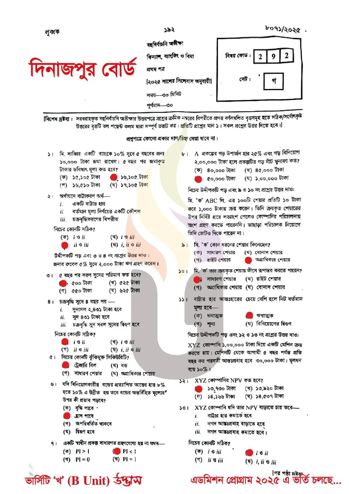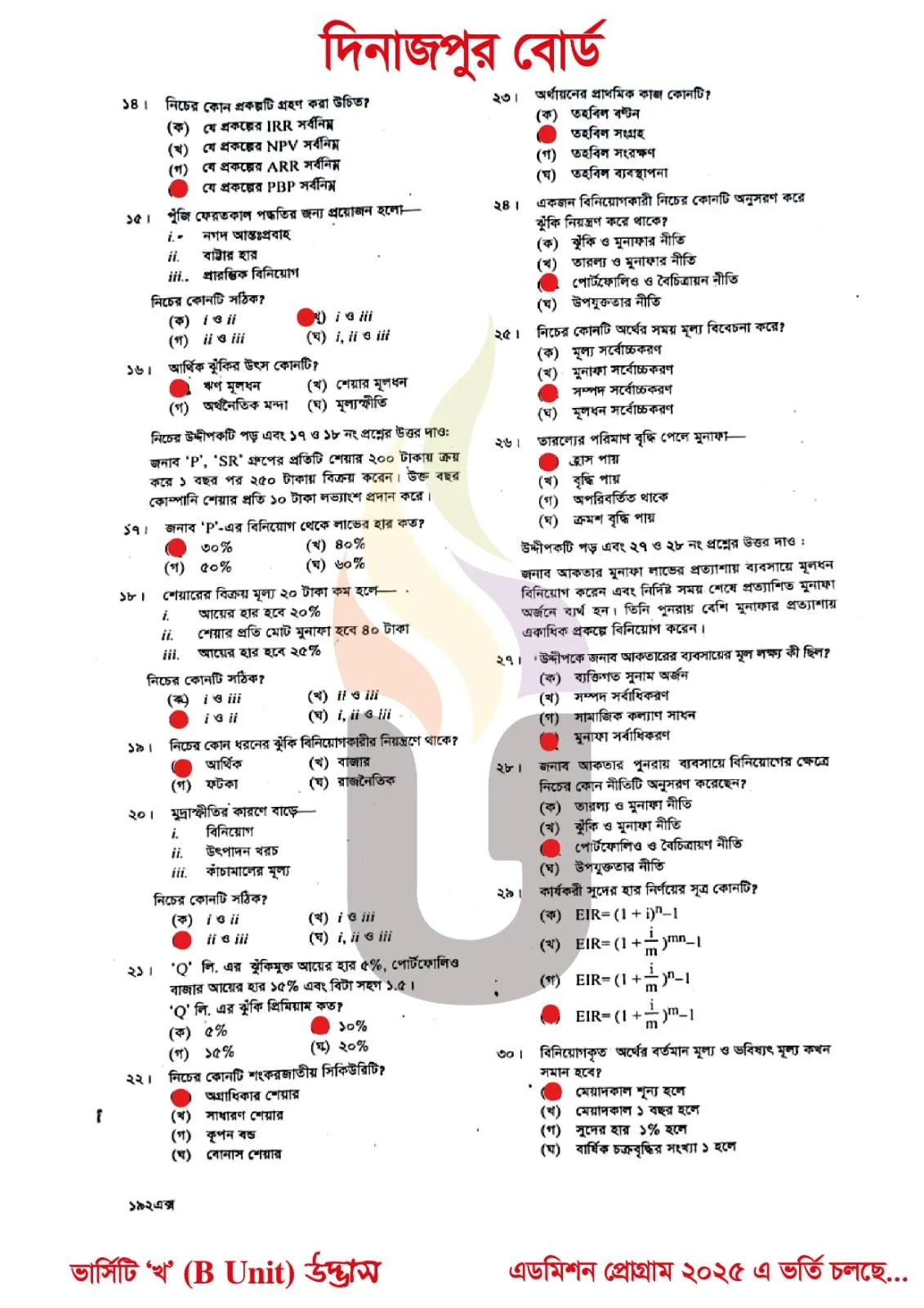Finance Banking and Insurance 1st Paper MCQ Question solution Dinajpur Board HSC 2025