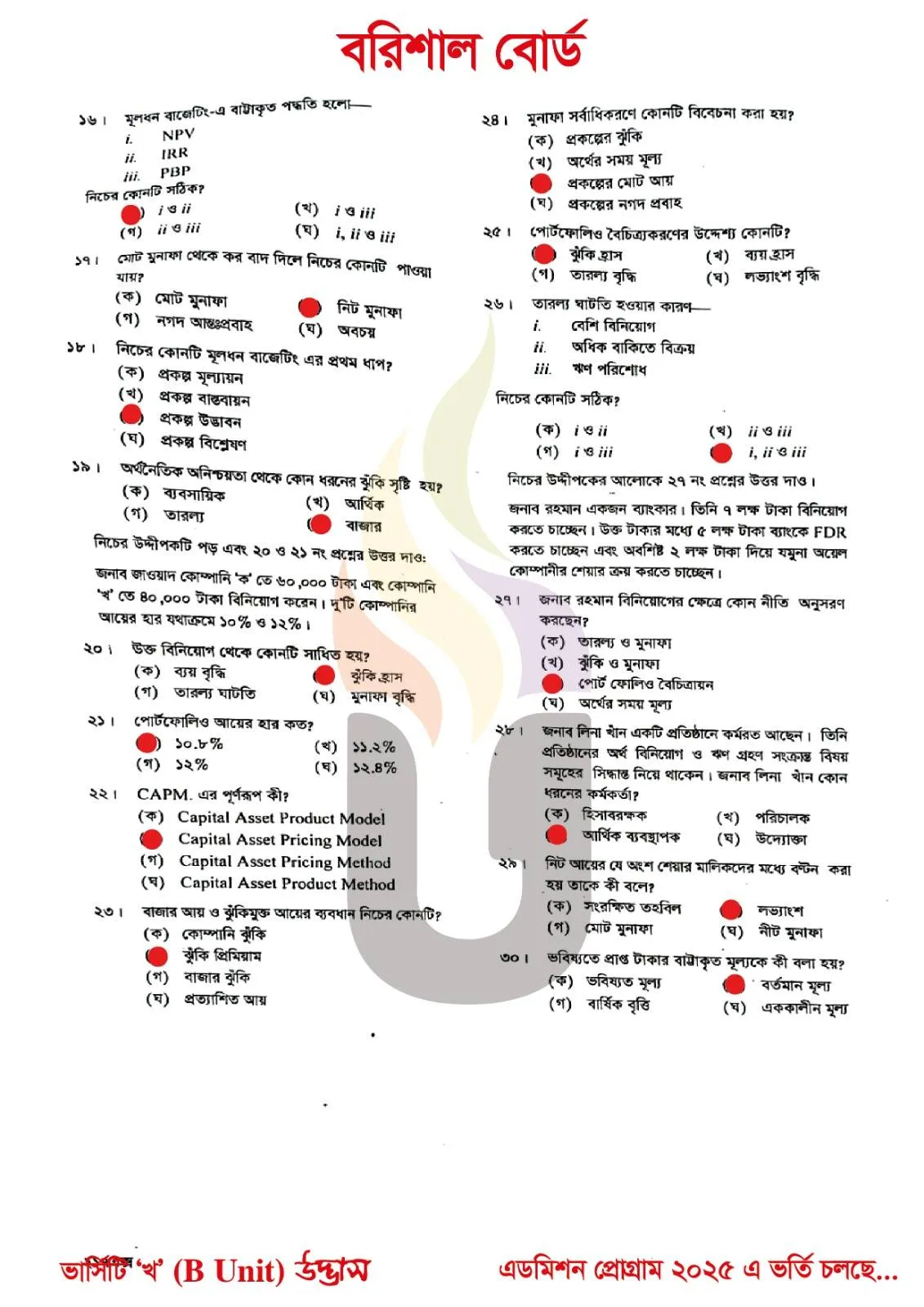 Finance Banking and Insurance 1st Paper MCQ Question solution Barisal Board HSC 2025
