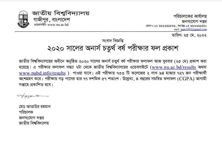 অনার্স চতুর্থ বর্ষের রেজাল্ট ২০২২, অনার্স ৪র্থ বর্ষ পরীক্ষার ফলাফল ২০২২, এন ইউ অনার্স ৪র্থ বর্ষ পরীক্ষার রেজাল্ট ২০২২; জাতীয় বিশ্ববিদ্যালয়ের অধীনে অনুষ্ঠিত ২০২০ সালের অনার্স ৪র্থ বর্ষ পরীক্ষার ফলাফল ২৫/০৫/২০২২ তারিখ প্রকাশ করা হয়েছে।