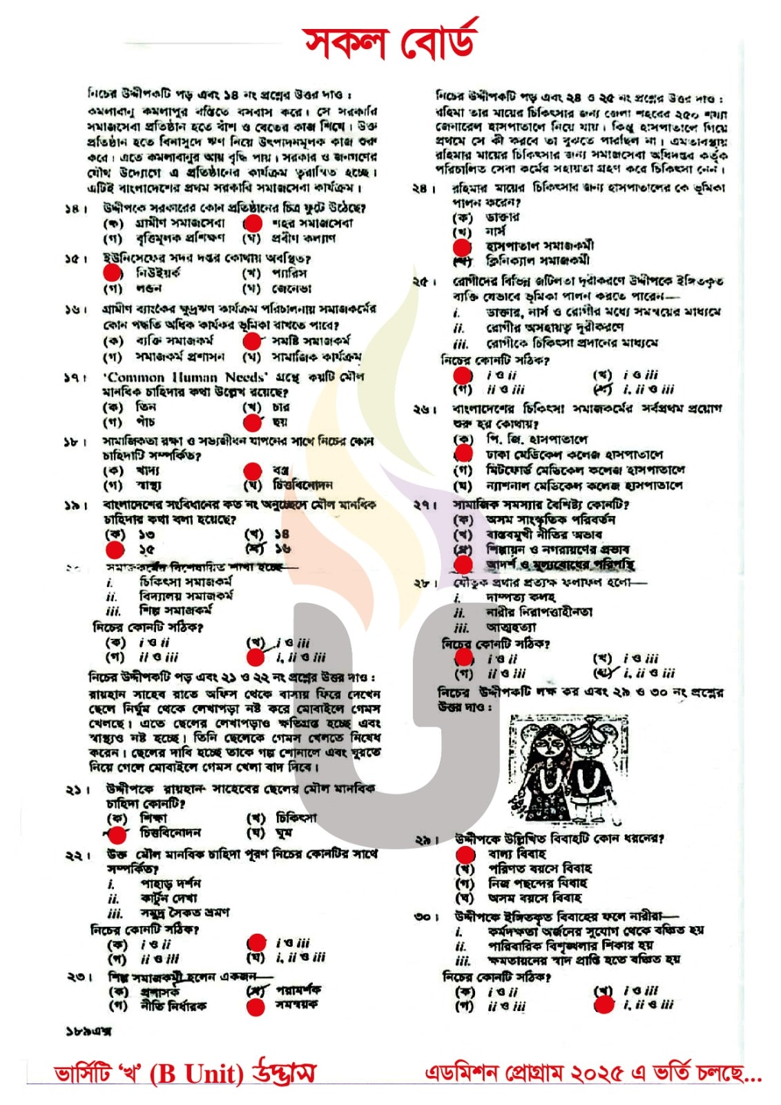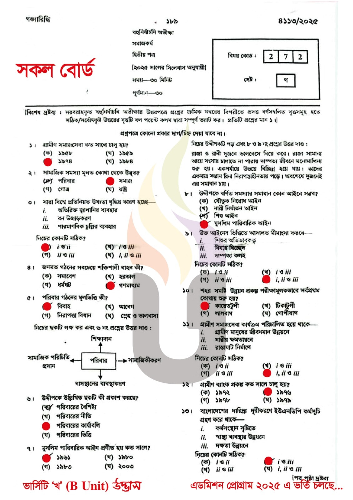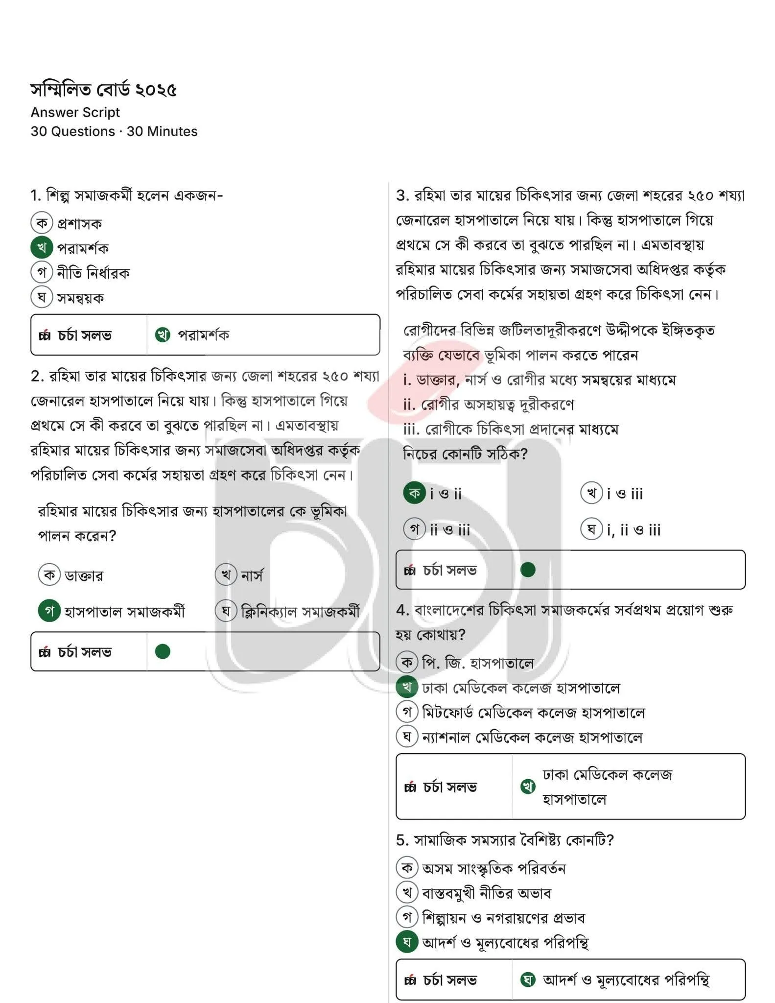 এইচএসসি ২০২৫ সমাজকর্ম ২য় পত্র MCQ উত্তরমালা